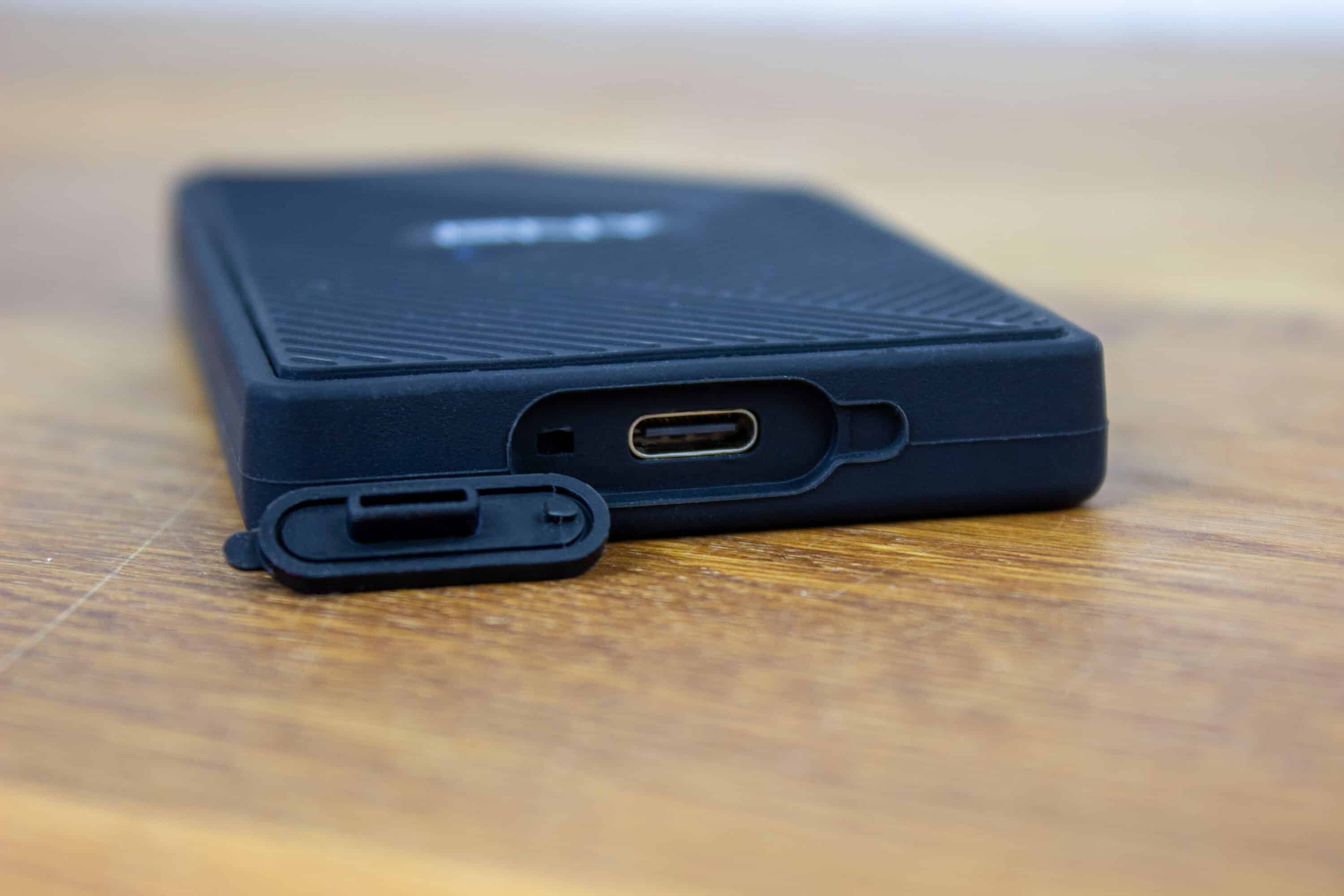 Auf der Unterseite der PNY RP60 finden wir eine kleine Gummiabdeckung. Da hinter versteckt sich der USB-C-Port. Verwendet wird USB 3.2 Gen 2×2, achtet also darauf, ob euer Gerät dies unterstützt, um die gesamte Bandbreite nutzen zu können. Ohne die erwähnte Gummiabdeckung ist natürlich auch kein IP65-Schutz gegeben.