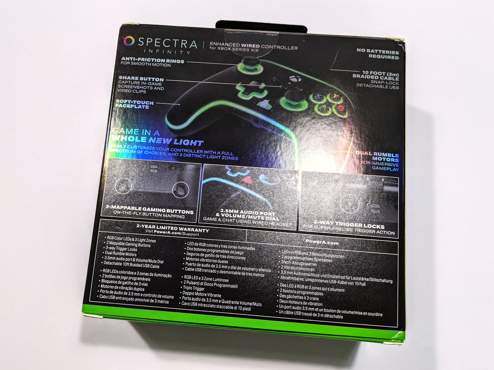 Zu diesen Features zählen unter anderem zwei Rumble-Motoren und zwei zusätzliche Tasten, die frei belegt werden können, wie man es bereits vom Enhanced Wired Controller kennt. Neu hinzugekommen sind zudem die Drei-Wege-Trigger-Locks, welche PowerA auch beim hochpreisigen FUSION Pro 2 bietet. Rein optisch sieht der Spectra Infinity nach einem einfachen schwarzen Xbox-Controller aus, bietet aber eine RGB-Beleuchtung mit vielen Farbvariationen.