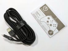 Das schwarze 3 m lange Micro-USB-Kabel ist umflochten, ein Klettverschluss zum Verkürzen auf die gewünschte Länge ist ebenfalls angebracht. Zudem besitzt das Kabel am Stecker zwei kleine Haken, die ein unbeabsichtigtes Herausziehen aus dem Controller verhindern. Will man das Kabel entfernen muss man von beiden Seiten leicht auf den Stecker drücken, um diesen zu lösen.