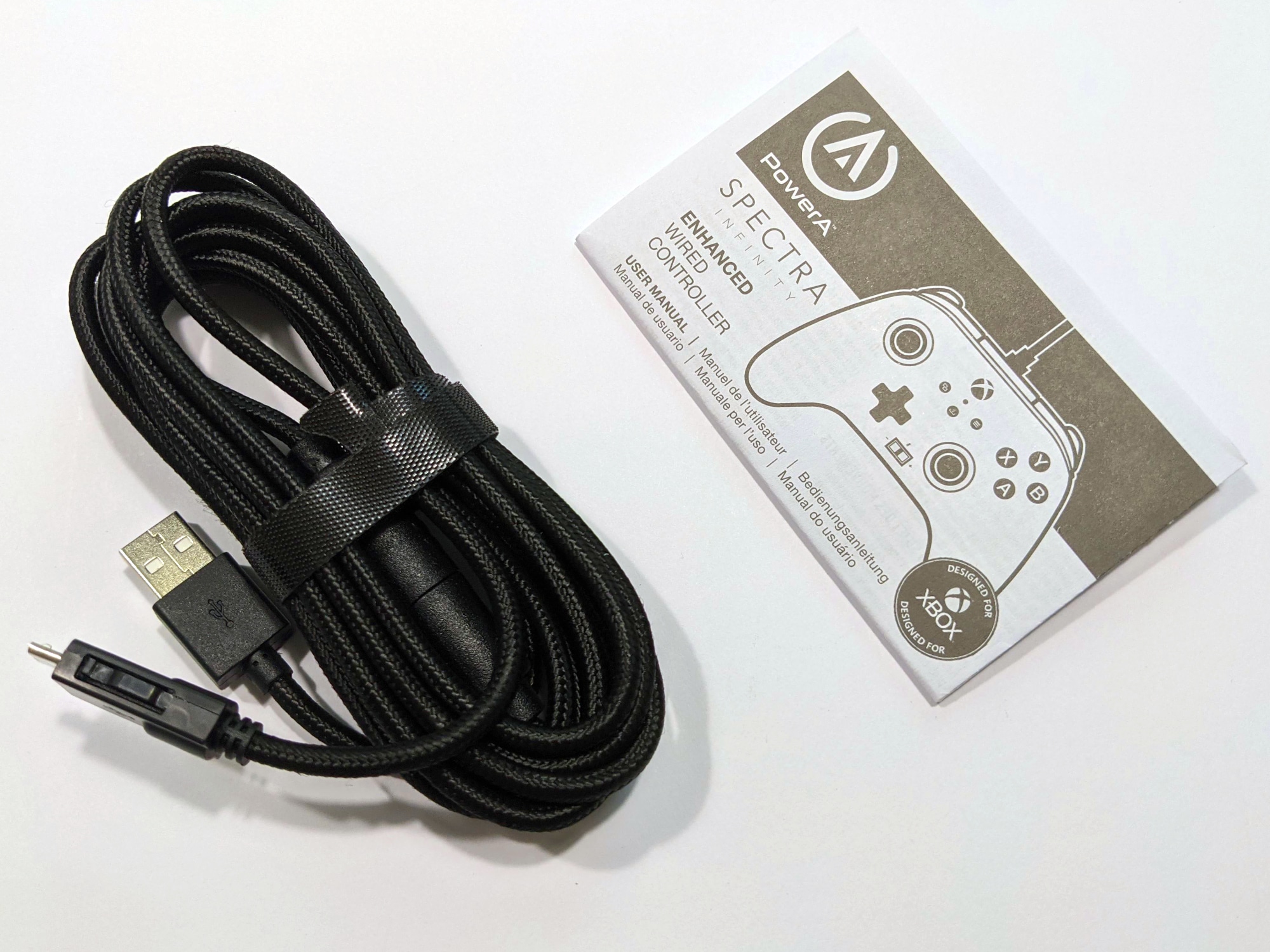 Der Spectra Infinity Enhanced Wired Controller wird in einem kompakten, schwarzen Karton ausgeliefert. Mit glänzenden Effekten und reichlich Bildern weist PowerA auf die RGB-Beleuchtung hin. Im Inneren des Kartons befinden sich neben dem Controller ein schwarzes, umflochtenes Micro-USB-Kabel und eine Kurzanleitung. Der Lieferumfang ist damit minimalistisch, bietet aber alles, was man benötigt und in dieser Preisklasse erwartet.
