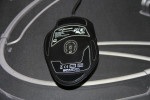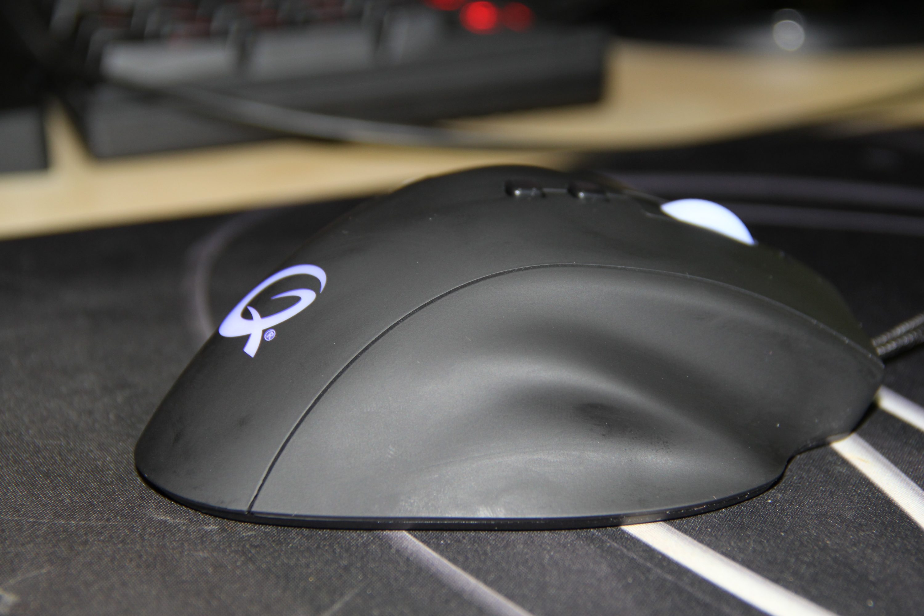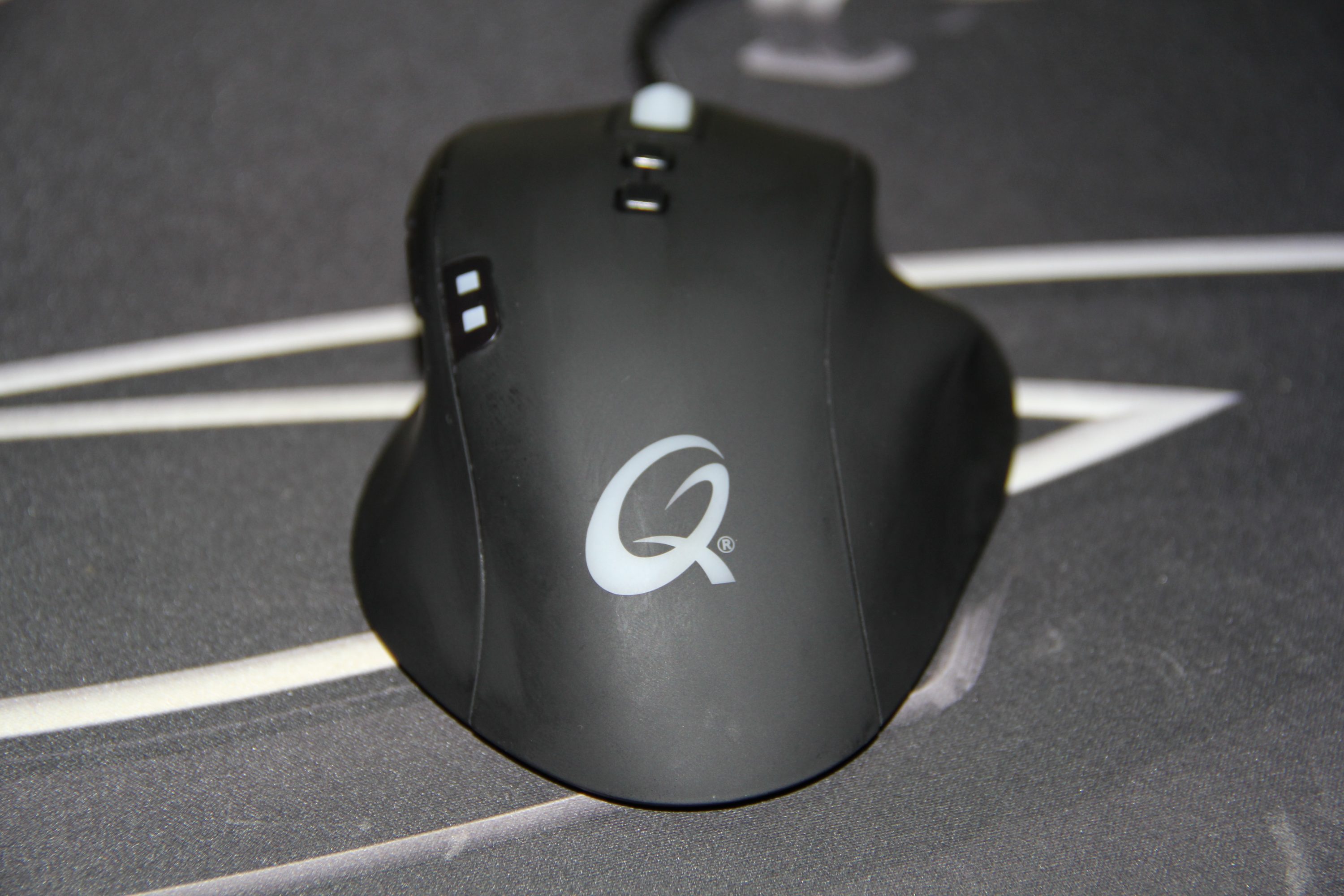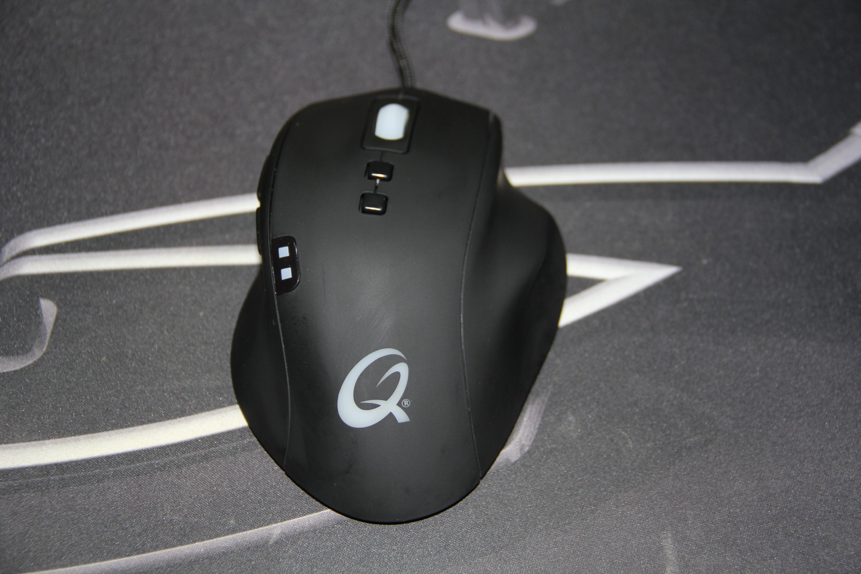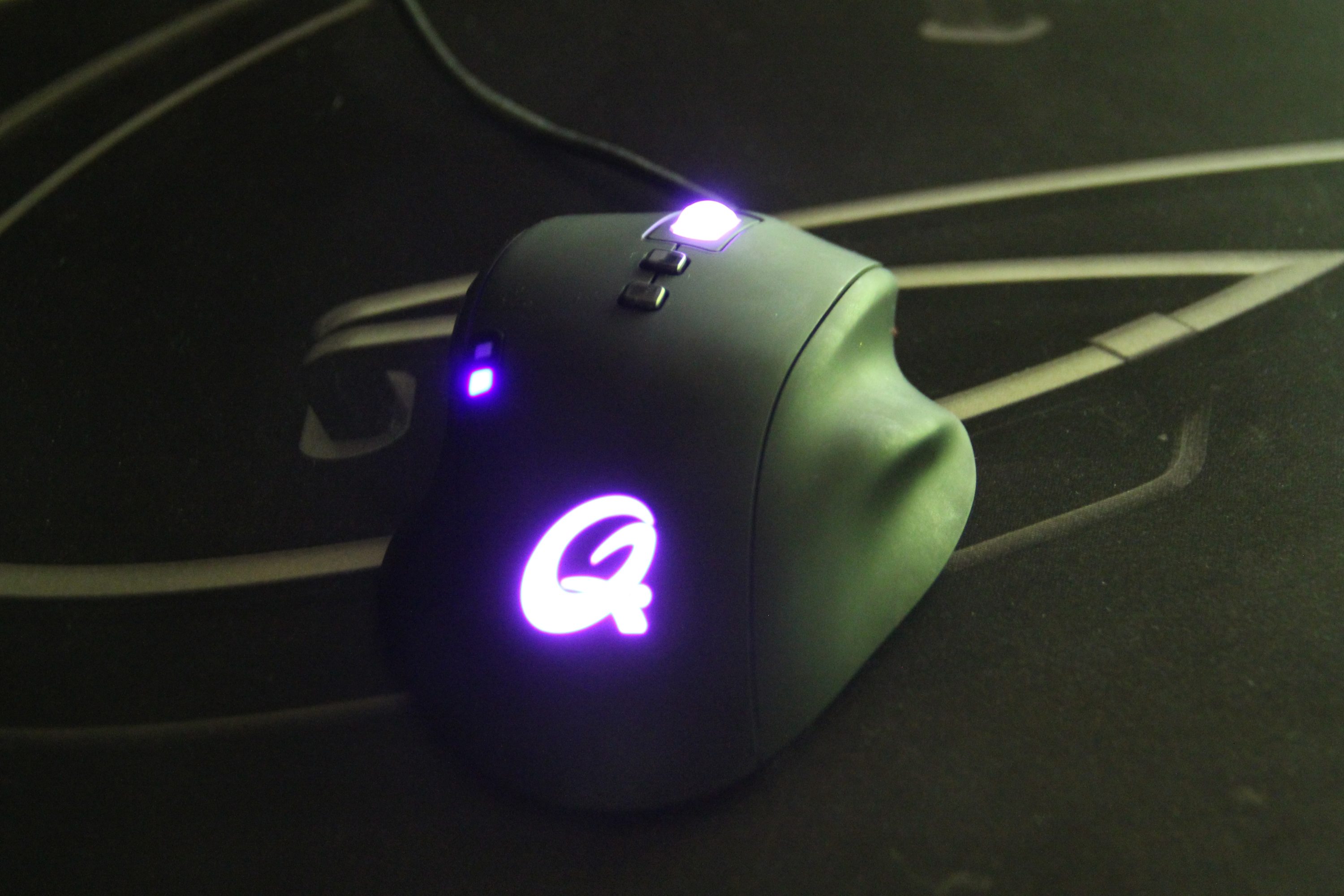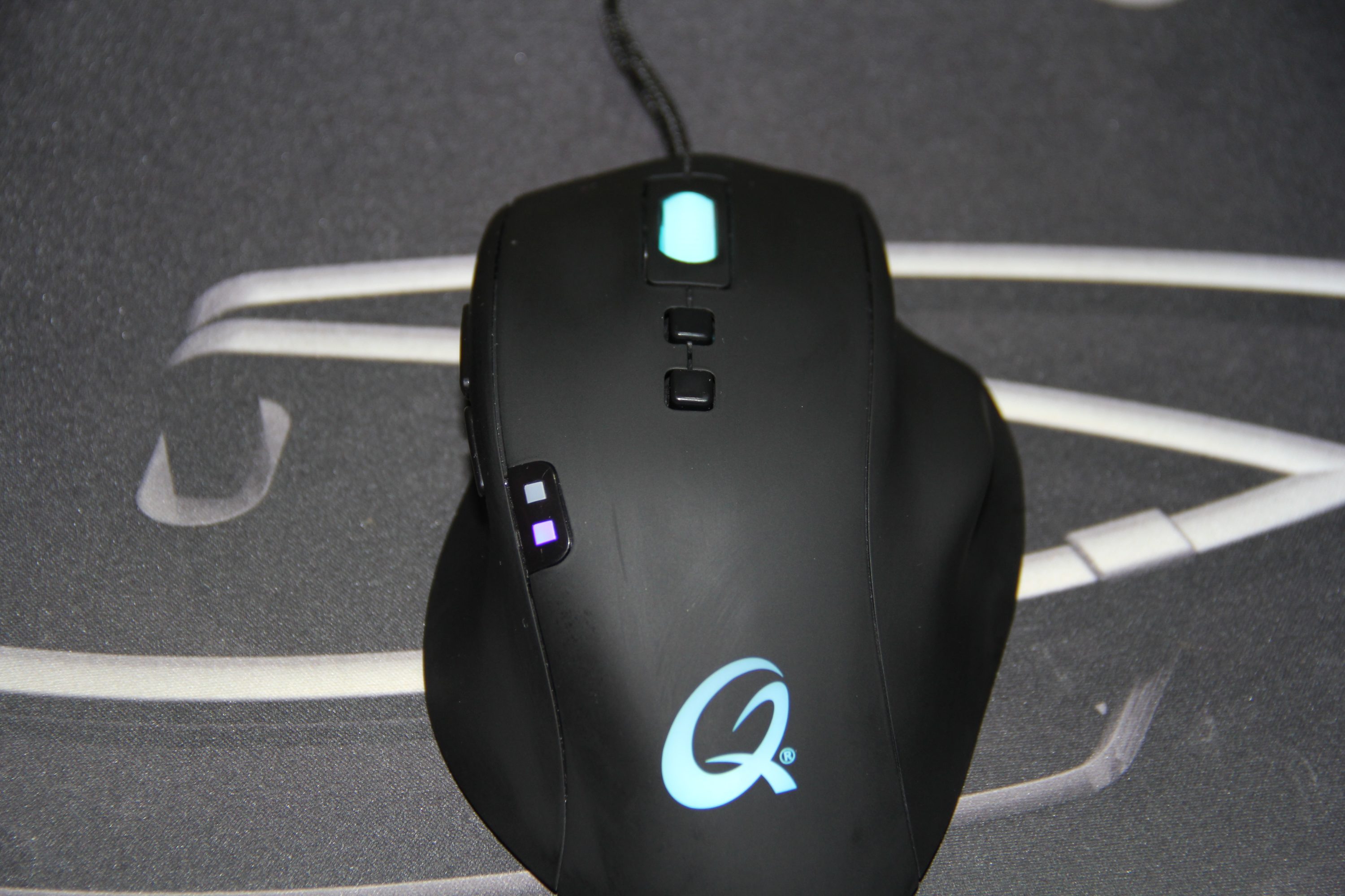 Die Haupttasten sind leicht zu drücken und geben ein lautes Feedback. Der Druckpunkt löst ab ca. 30 Gramm aus. Die auf der Maus liegenden kleineren Zusatztasten sind relativ weit von den anderen Bedienelementen entfernt, weshalb sie nicht sofort erreichbar sind. Zeige- oder Mittelfinger müssen ihre gewohnte Position verlassen, um die schwarzen quadratischen Zusatztasten anvisieren zu können, welche üblicherweise für das Verändern der Geschwindigkeit (DPI) eintreten. Mittig links sind zwei kleine Lämpchen zu sehen. Sie zeigen an, welche der drei konfigurierbaren Geschwindigkeiten aktuell ausgegeben wird. Das Mausrad ist hellweiß und dient den 16,7 Millionen Farben als Fenster. Auch das markante „Q“ am unteren Bereich der Maus leuchtet hierzu synchron auf. Das Plastikrad ist gängig und in seinem Feedback ziemlich schwach. Es ragt kaum weit aus dem Stück heraus und ist beim Klicken ebenfalls angenehm. Leider ist es nicht vierachsig, sondern findet bloß zum hoch oder runter scrollen Verwendung.