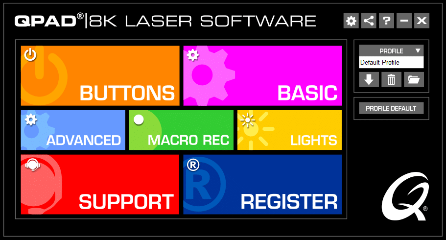 Wenn man den Treiber der QPAD 8K Laser-Maus installiert und diesen verwenden möchte ist es ratsam, eine Sonnenbrille aufzusetzen oder den Monitor dunkler zu stellen – das Menü blendet mit intensiven Farben. Dennoch wirkt die Software sehr modern designt und ist zudem übersichtlich.