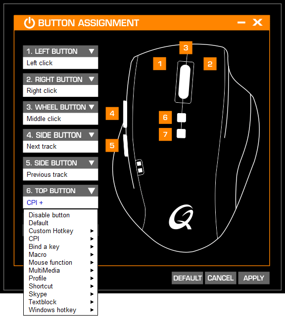 Zum Neubelegen der Knöpfe stehen zahlreiche Einstellungsmöglichkeiten bereit. Hier kann man zwischen vorgefertigten Funktionen wie zum Beispiel Multimedia, Windows-Hotkeys sowie mausspezifischen Möglichkeiten wählen. Natürlich lassen sich auch sehr einfach eigene Macros aufzeichnen und eigene Hotkeys erstellen. Es ist sehr schade, dass die Maus hier zwar sehr viele Funktionen bietet, diese aber aufgrund der geringen Knopfanzahl nur wenig zum Nutzen kommen können. QPAD wirbt mit 7 programmierbaren Tasten, jedoch würde ich Tasten wie Links- oder Rechtsklick nun wirklich selten anders belegen wollen. Deshalb sehe ich nur zwei hierfür vorgesehene Tasten. Diese liegen links und lassen sich sehr bequem mit dem Daumen anvisieren.
