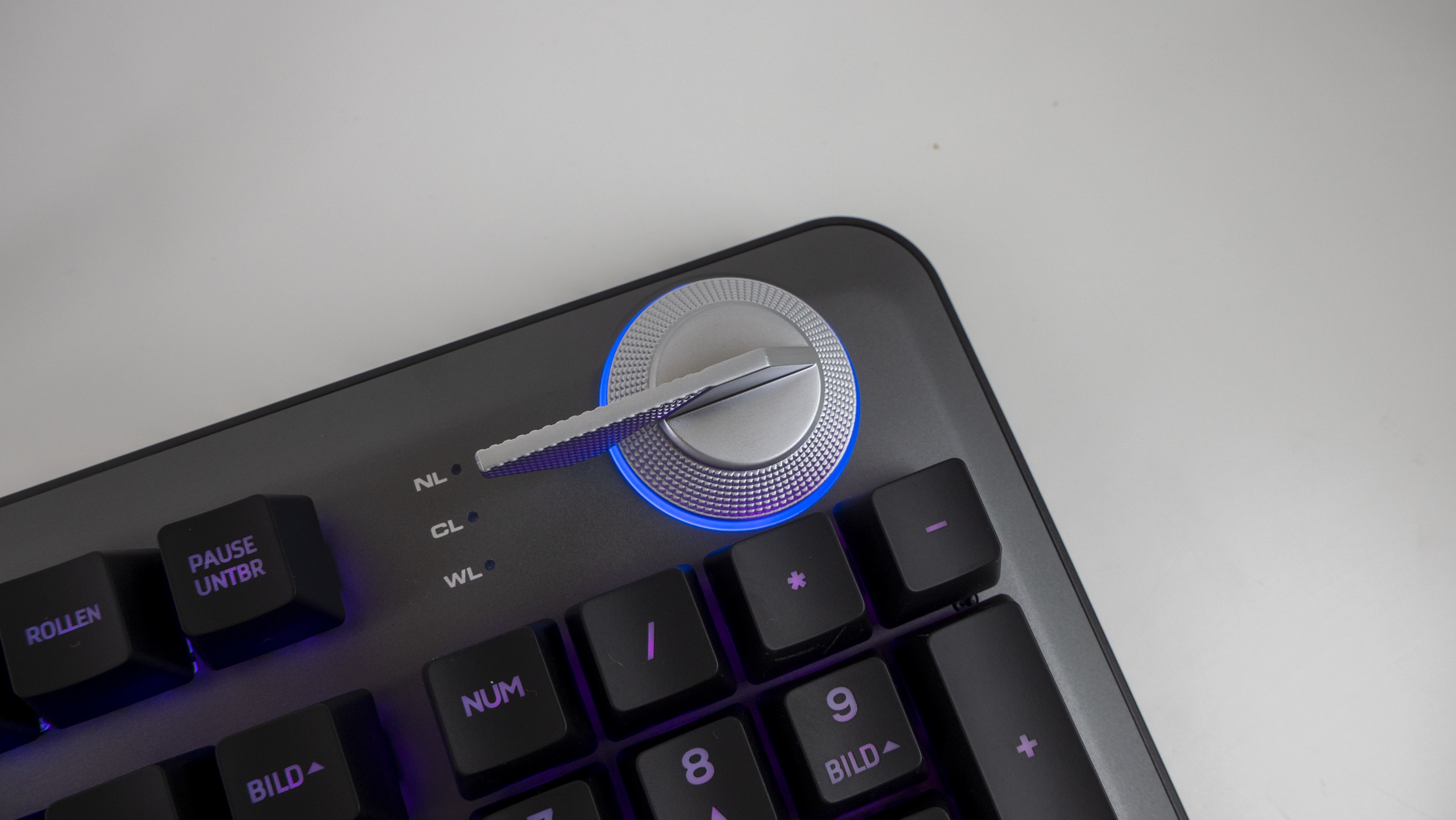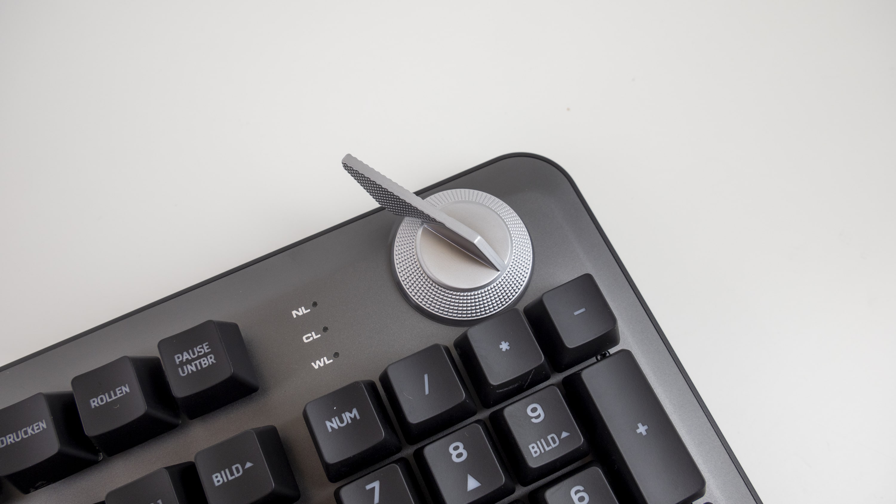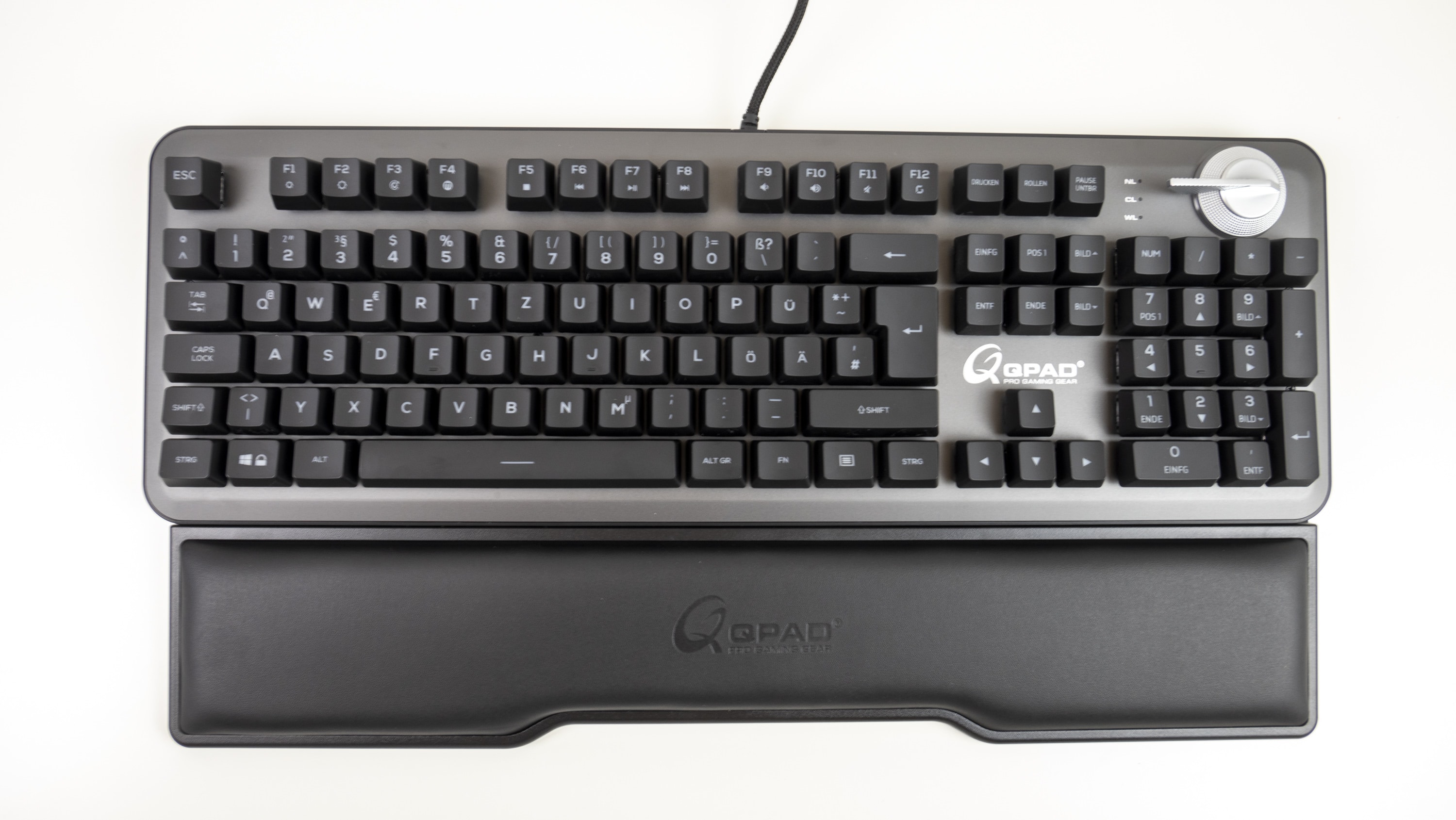 Neben dem auffälligen Drehregler finden sich auf der QPAD MK95 keine weiteren Funktionstasten. Sämtliche Media-Funktionen und Makros werden mit der FN-Taste möglich gemacht. Ausgenommen die Regelung der Lautstärke: dazu dient der Kunststoffring unter dem Aluminiumschalter für den Switchwechsel.