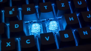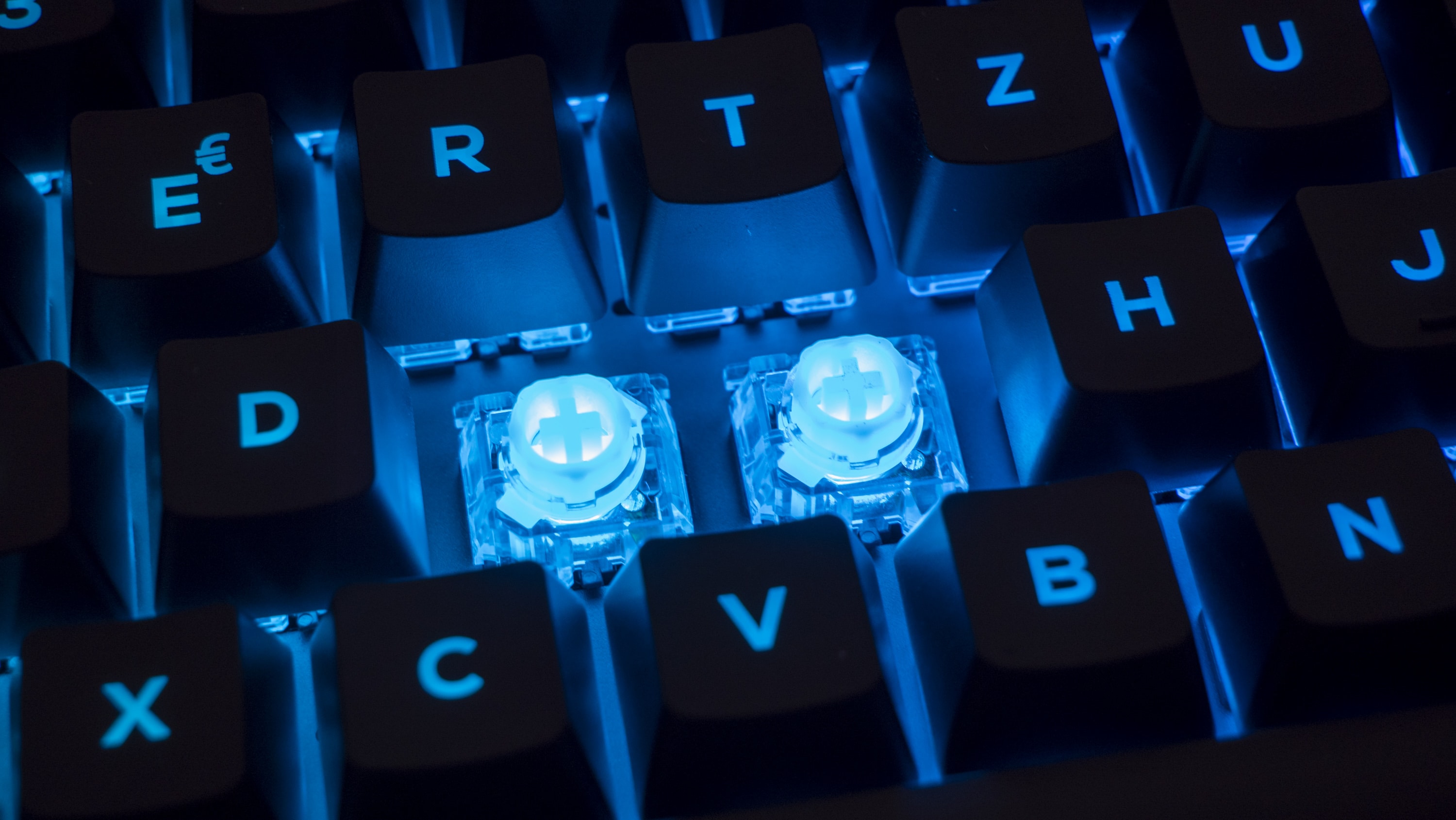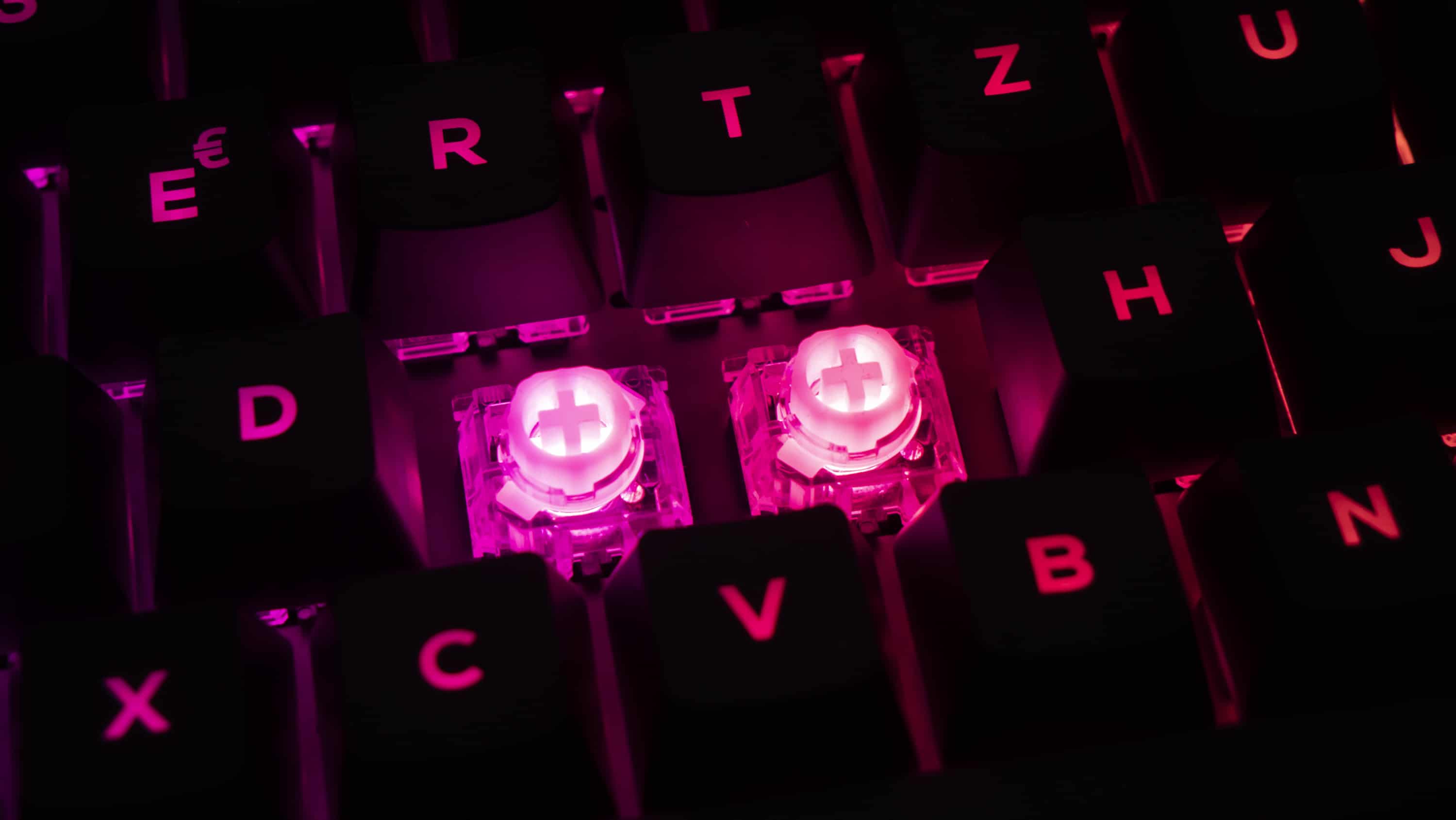 Im Klartext bedeutet das, die Schalter können entweder ein lineares oder ein taktiles Feedback geben – entweder leise und ohne Widerstand oder ein Klicken mit Widerstand. Zwischen den Schaltereigenschaften kann man mit dem Aluminiumschalter oben rechts auf der Tastatur mechanisch wechseln. Ist der Schalter auf 11 Uhr-Stellung verhalten sich die Switches linear, ist er auf 9 Uhr-Stellung verhalten sie sich taktil, da in jedem Switch ein kleiner Metallstift hochgeklappt wird, der anschließend das Klickgeräusch verursacht und den Widerstand aufbringt. Optisches Feedback bekommt man durch die LED-Beleuchtung unter dem Kunststoffring: Dieser leuchtet je nach Einstellung rot oder blau.