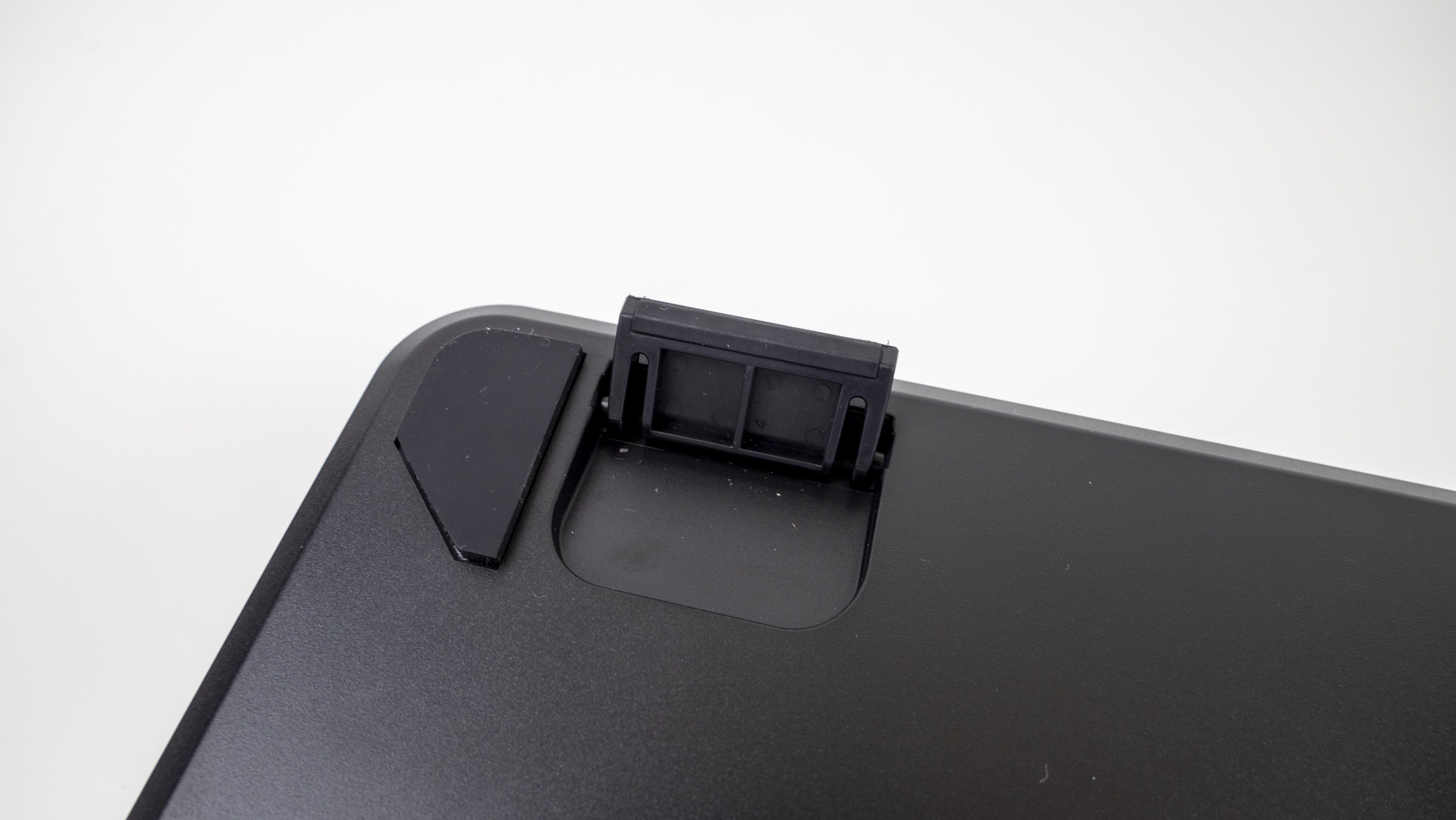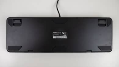 Auf der Rückseite lassen sich zwei Füße ausklappen, um die Tastatur zu erhöhen. Außerdem sind insgesamt sechs Gummiflächen angebracht, die das Verrutschen auf dem Schreibtisch fast unmöglich machen.