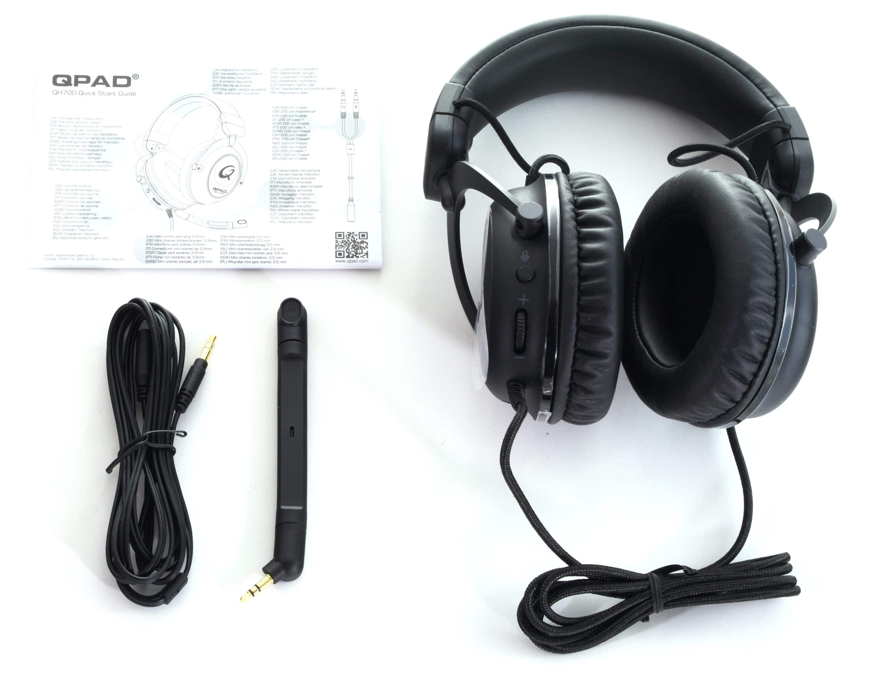 Beim Lieferumfang gibt es von QPAD ein recht übliches Paket: Neben dem QH-700 selbst, an dem das vierpolige Anschlusskabel bereits fest montiert ist, gibt es noch ein weiteres Kabel mit zwei dreipoligen Anschlüssen, ein Ansteckmikrofon sowie eine kurze Anleitung.