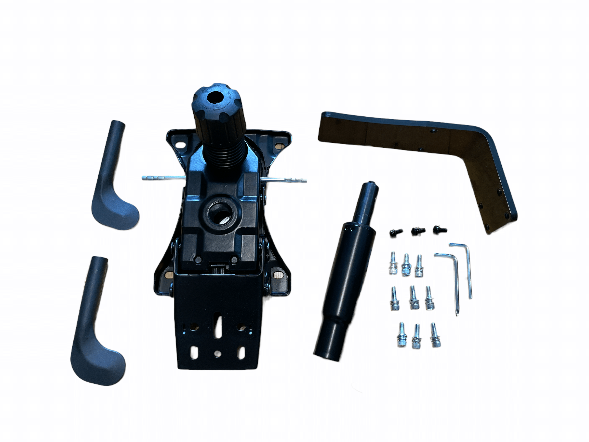 Jetzt schnappt man sich den Sitz, dreht ihn um und montiert mit den beigelegten silbernen Schrauben den mechanischen Teil an die Sitzfläche. Die Chance kann man auch direkt nutzen und die Hebel für das Verstellen des Gaming-Stuhls über die dafür vorgesehenen Metallstifte stecken. Als Letztes schnappt man sich das schwarze gebogene Metallteil und montiert dieses ebenfalls mit den silbernen Schrauben an der Unterseite der Mechanik.