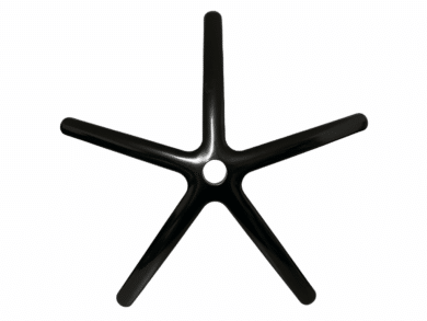 Das metallische Fußkreuz ist mit einem schwarzen Hochglanzlack überzogen. Dadurch wirkt das Fußkreuz sehr wertig. Insgesamt macht es auch ohne den Lack einen wertigen und sehr stabilen Eindruck. Selbiges gilt für die mitgelieferten Hartbodenrollen.