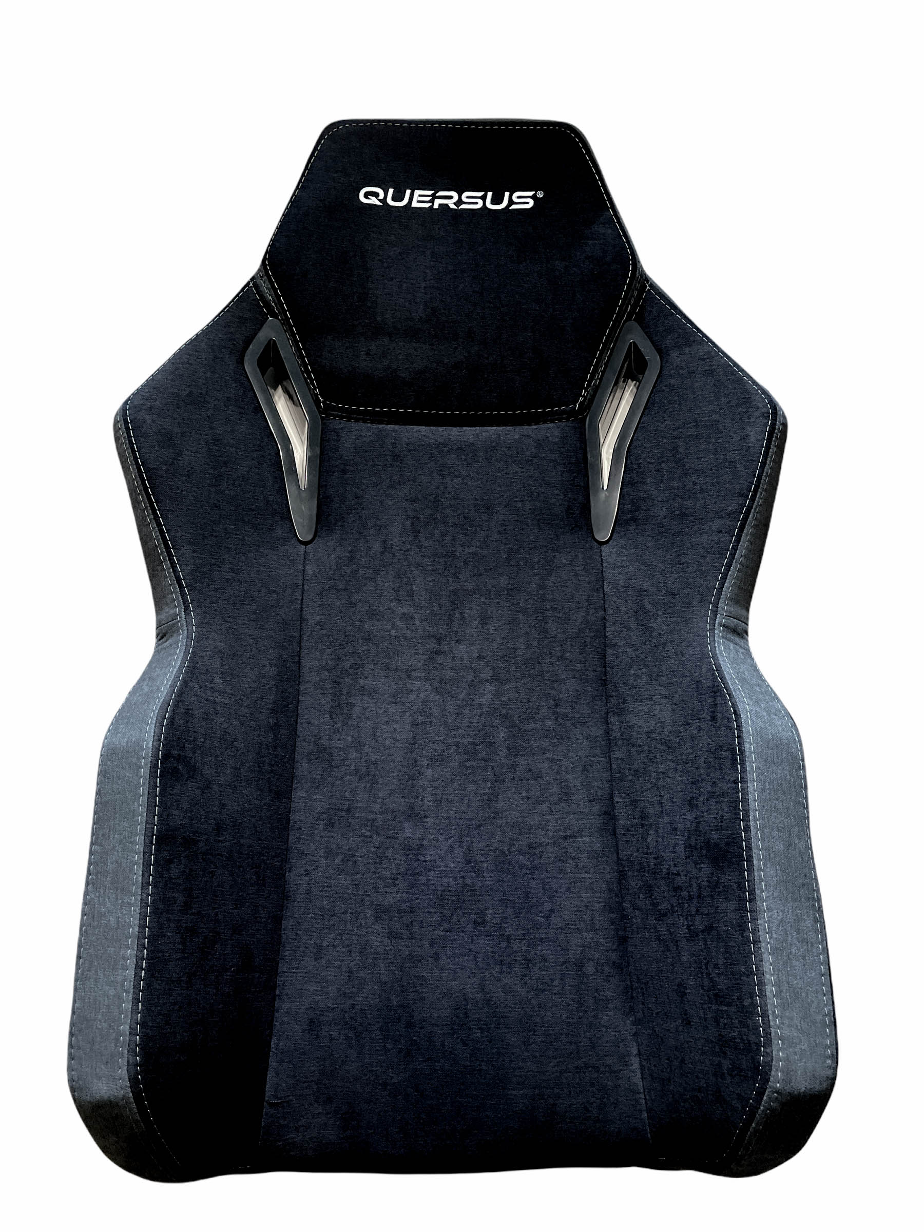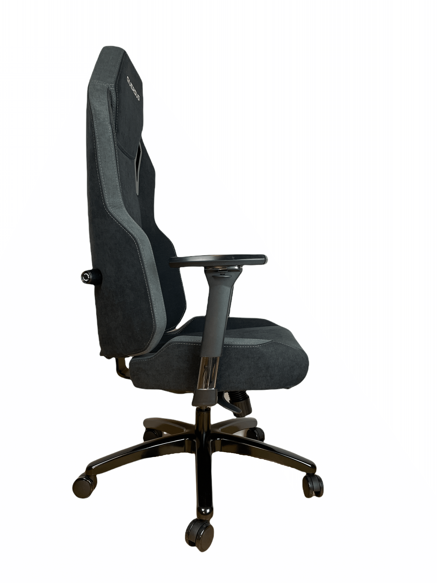 Dem Vaos 505 ist die Racing-Optik nicht abzuerkennen. Der Sitzfläche wurden Wangen spendiert, ebenso auch der Rückenlehne. Die Schulterpartie hat eine leichte Wölbung, die sehr gut die Sitzposition unterstützt. Im Kopfbereich hat sich QUERSUS mit einem weißen Logo verewigt. Der Stoff, mit dem der Stuhl bezogen wurde, soll laut Hersteller verschiedenste positive Eigenschaften vereinen. Er soll nicht nur strapazierfähig sein, sondern auch atmungsaktiv und vor Flüssigkeiten schützend. Neben diesen Eigenschaften fühlt sich der Stoff sehr angenehm und weich an. Die Rückenlehne ist bestückt mit einer Lordosenstütze, welche sich im Inneren befindet. Mit dem Drehknopf, der seitlich an der Rückenlehne platziert wurde, lässt sich die Wölbung verstärken bzw. abschwächen. Optisch ist dabei nur ein geringer Unterschied zu erkennen.
