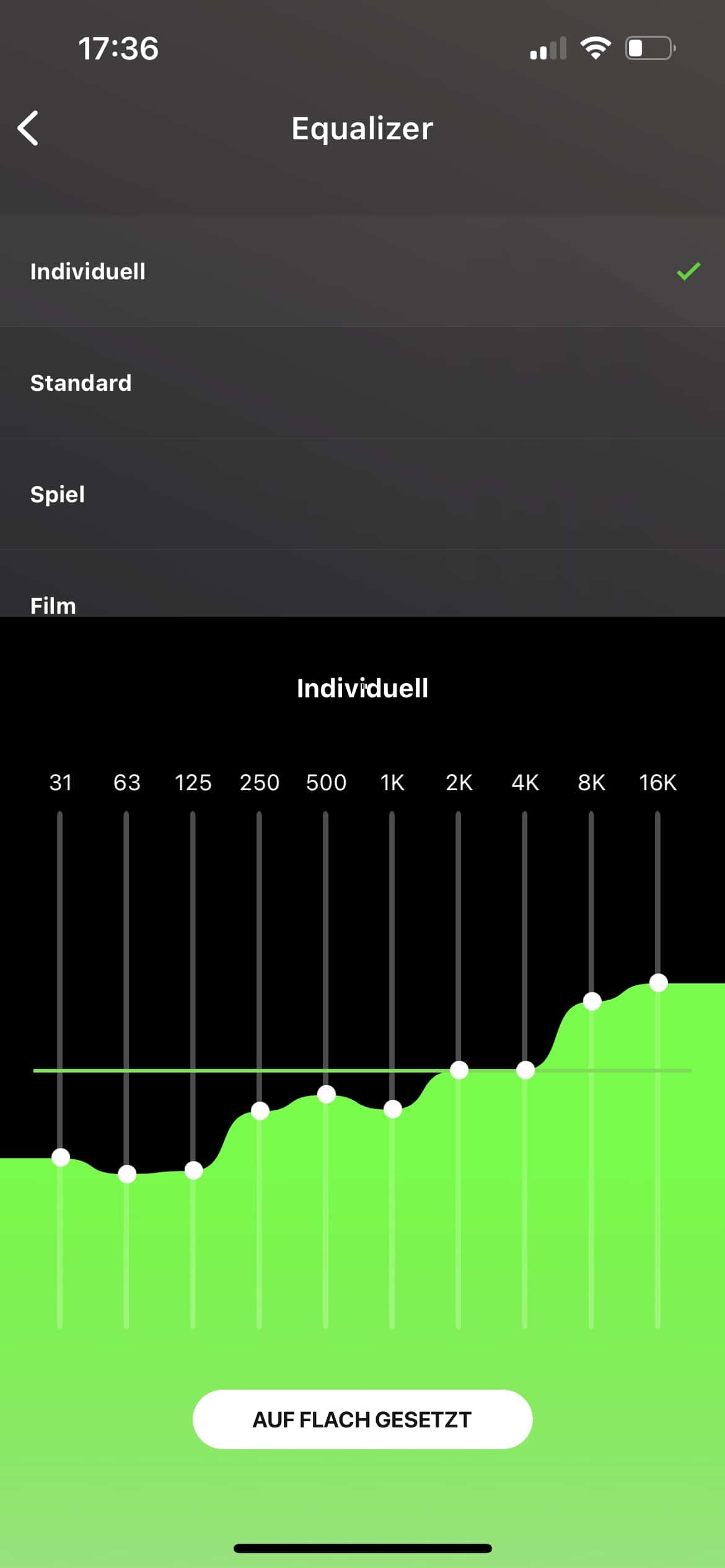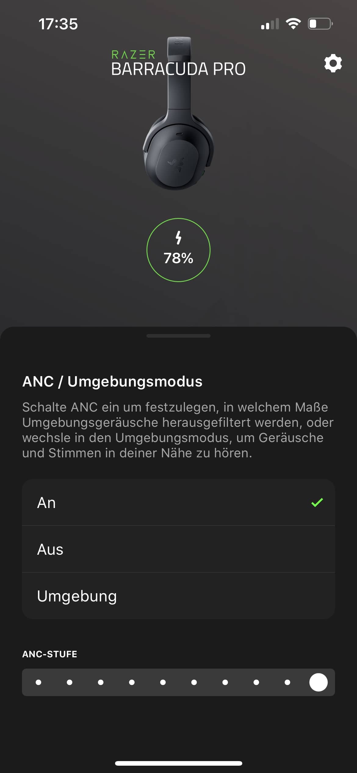 Das ANC regeln wir in insgesamt zehn Stufen, während sich der Klang per Equalizer feinjustieren lässt. Alternativ stehen hier insgesamt vier Presets zur Wahl.