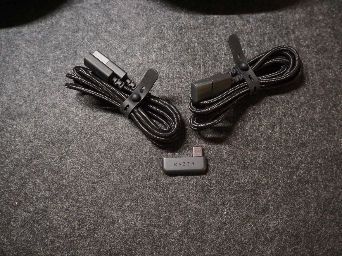 Zwischen Ohrmuscheln und Kopfbügel befindet sich, noch einmal mit dem Razer-Schriftzug bedruckt, ein weiteres verstecktes Fach, das die Kabel beherbergt. Konkret handelt es sich dabei um ein USB-A- auf USB-C-Kabel mit einer Länge von 1,5 Metern, sowie ein weiteres USB-C-Verlängerungskabel mit derselben Länge. Abgerundet wird der Lieferumfang durch einen kleinen Wireless-Receiver samt USB-Type-C-Port.