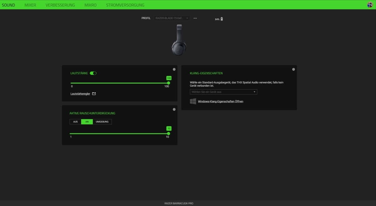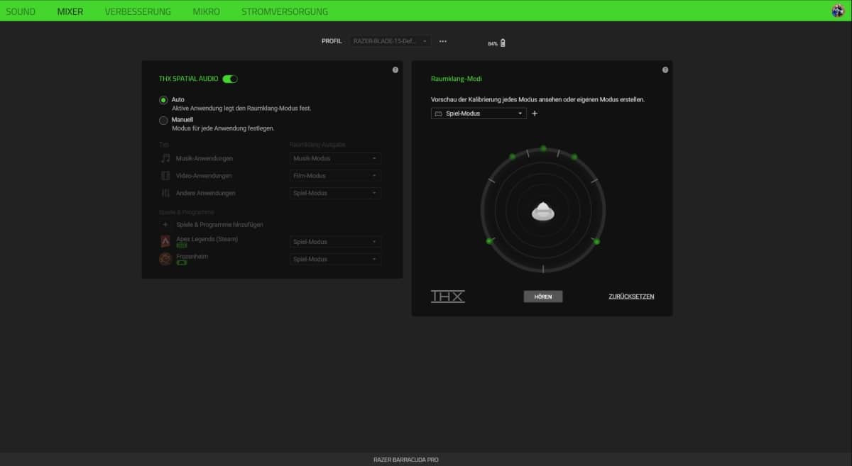 Ganz ähnlich sieht es am PC aus. Wobei hier zusätzlich die Anpassung des THX Spatial Audio-Klangs samt verschiedener Raumklang-Modi hinzukommt. Diese können wir sogar für einzelne Spiele oder Anwendungen einzeln festlegen.