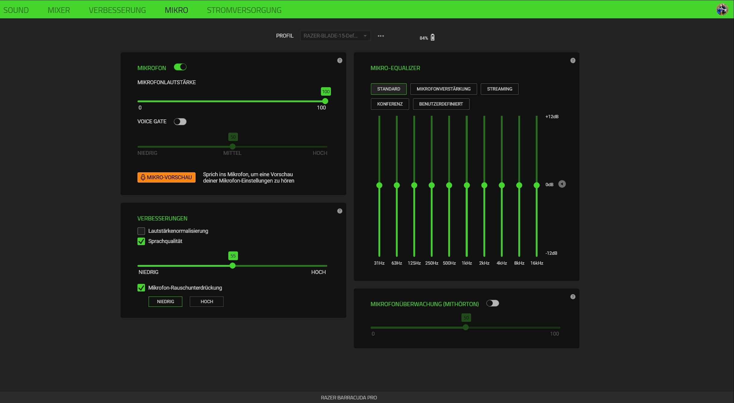 Beim Mikrofon stehen neben Lautstärke, Voice Gate und verschiedenen Verbesserungen ebenfalls insgesamt vier EQ-Presets zur Wahl, während wir auch hier in insgesamt 10 Bändern selbst Hand anlegen dürfen. Dank Mic-Vorschau hören wir zudem direkt im Programm, wie sich der Klang verändert. Grandios, derart umfangreiche Einstellungsmöglichkeiten bietet keine andere Begleit-Software.