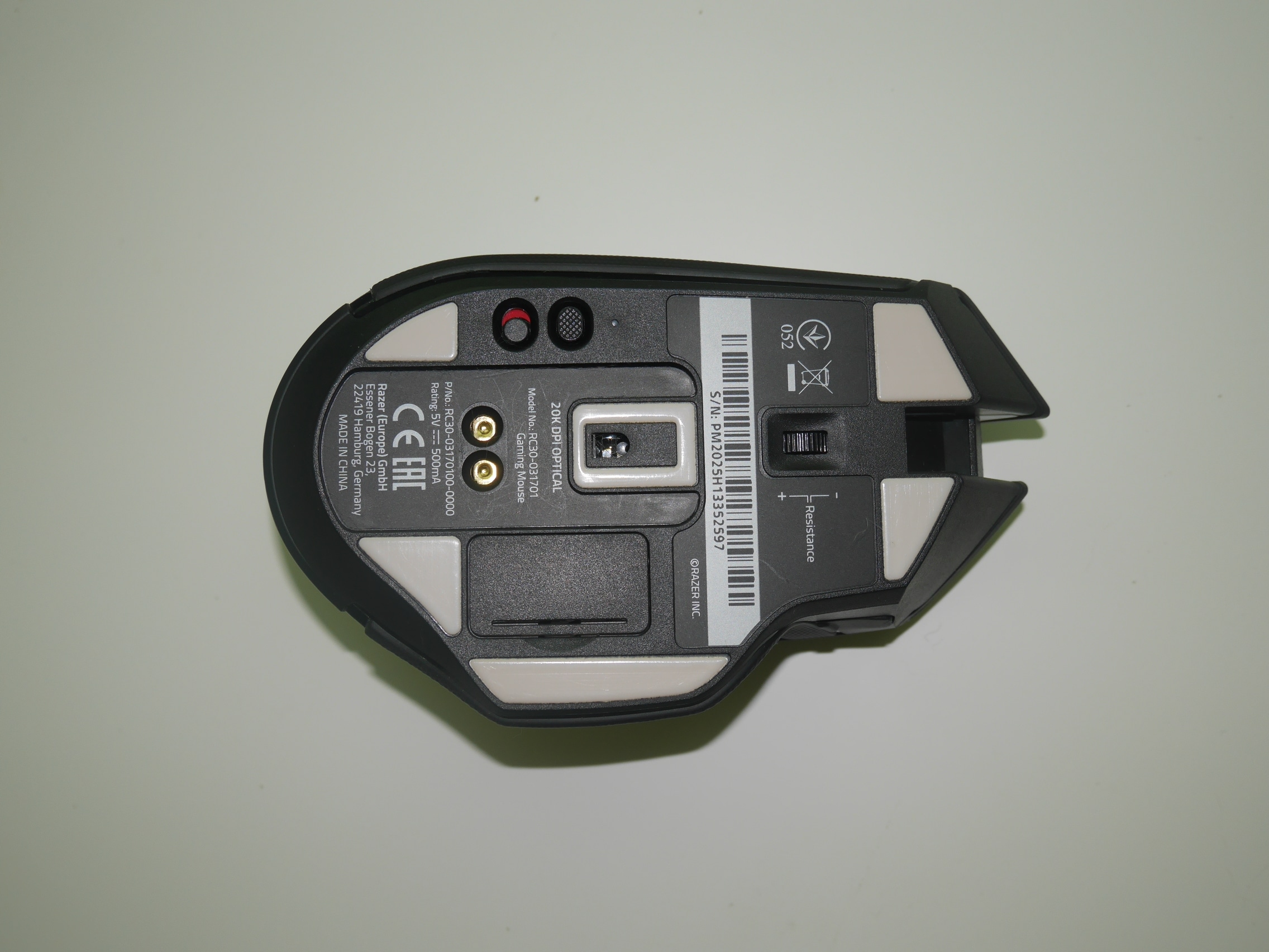 Die Razer Basilisk Ultimate eignet sich ausschließlich für Rechtshänder. Die rechte Außenseite der Maus besitzt deshalb keine Tasten, auf der linken Außenseite befinden sich zwei feste Tasten sowie eine optional per Magnethalterung hinzufügbare dritte Seitentaste. Die Rasterung des 4-Wege-Scrollrads lässt sich über einen Drehregler auf der Unterseite von ganz leicht (keine Rasterung erkennbar) bis stark (deutliche Rasterung erkennbar) individuell einstellen. Neben den beiden Haupttasten bietet die Maus unter dem Scrollrad außerdem noch zwei zusätzliche frei programmierbare Tasten.