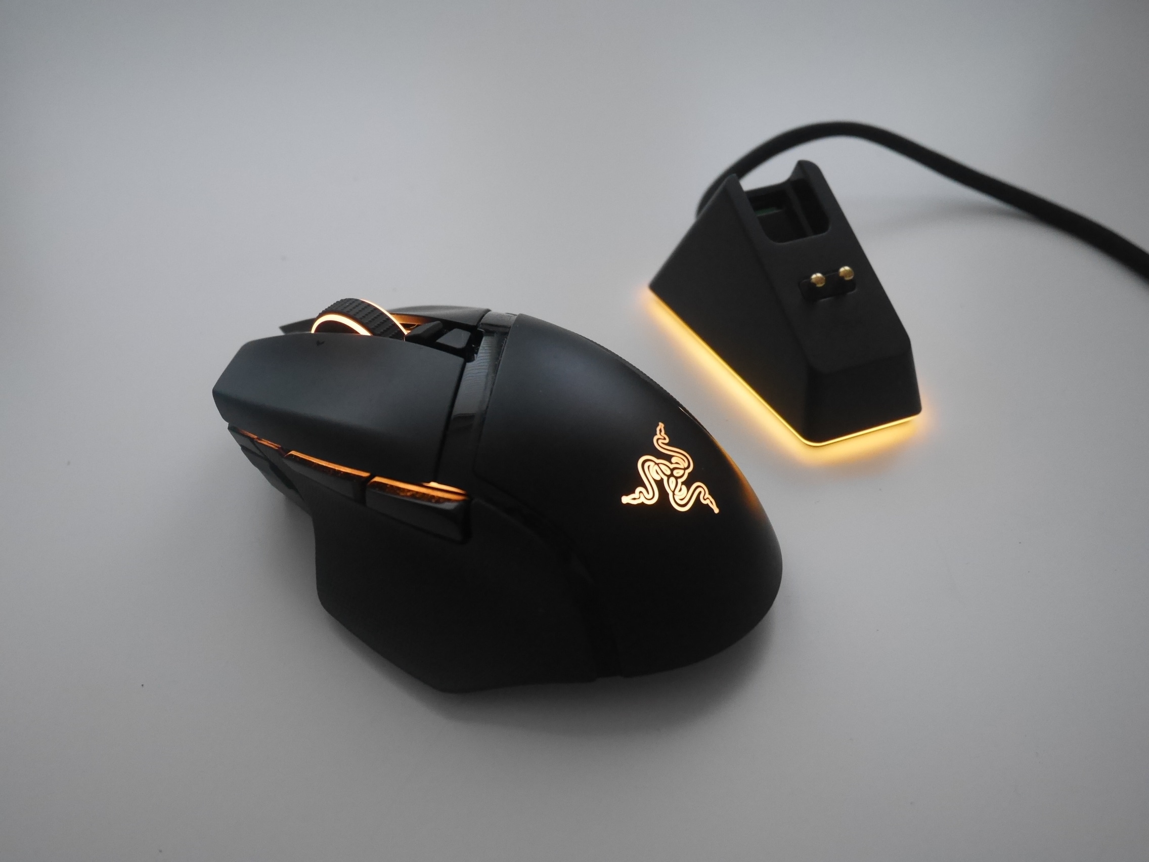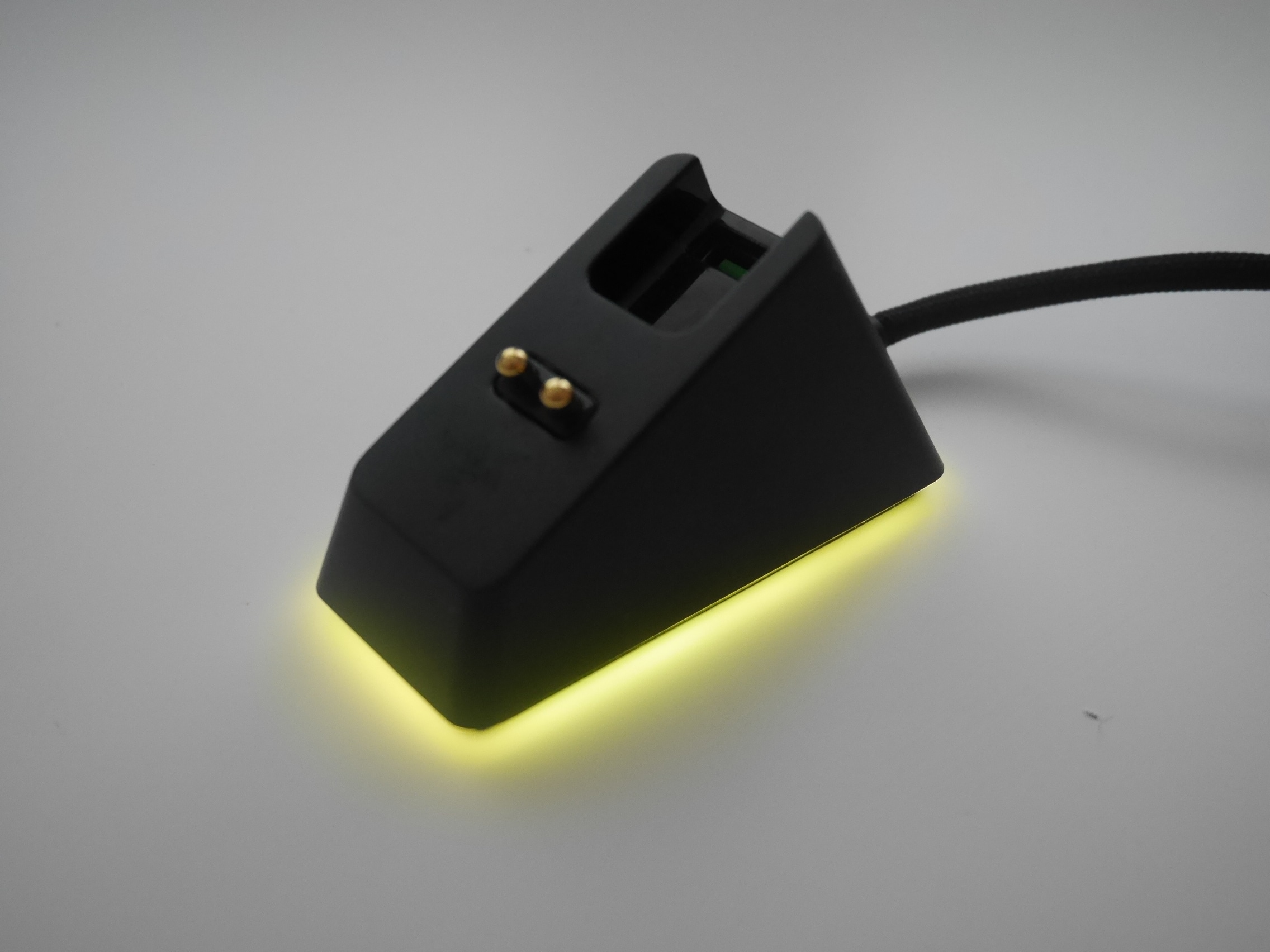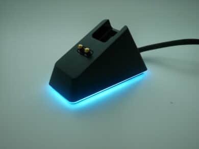 Auch die Beleuchtung der Maus und der Ladestation kann jeweils getrennt über Razer Synapse 3 eingestellt werden. Neben der Beleuchtung um Mausrad verfügt die Razer Basilisk Ultimate über ein beleuchtetes Logo. Die Ladestation verfügt über einen Leuchtkranz am Fuß, der zur Anzeige des Akkustands genutzt werden kann.