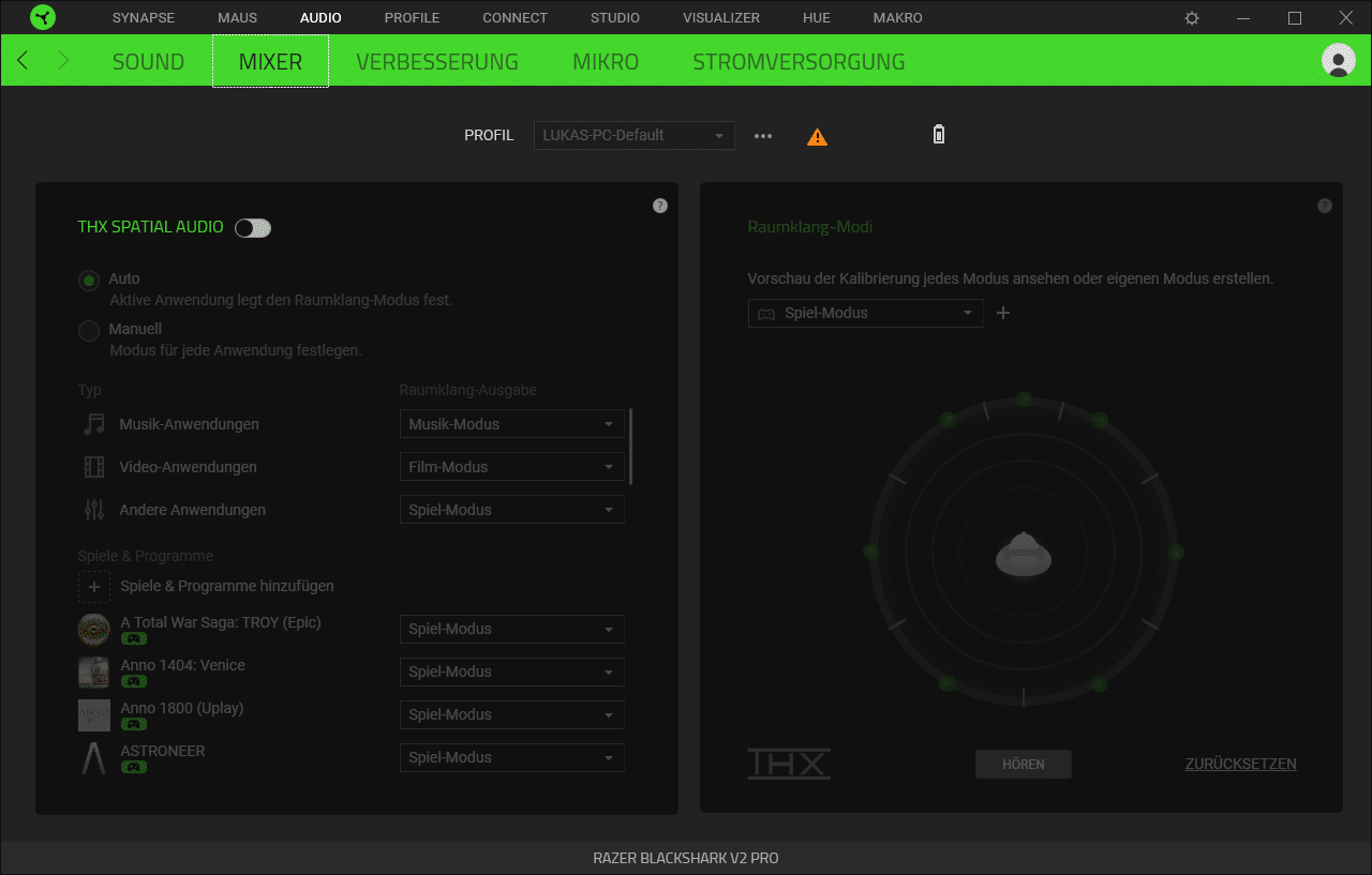 Razer Synapse ist eine wirklich umfangreiche Software, die jeder Nutzer von Razer-Peripherie schon kennen sollte. Sie kommt mittlerweile überall zum Tragen. Beim Razer BlackShark V2 Pro ist sie durch THX Spatial Audio wieder genau so umfangreich. Habt ihr eben jenes aktiviert, kann der Sound komplett individual eingestellt werden. Unter Verbesserungen geht sogar noch weiter und ihr könnt noch mehr einstellen.