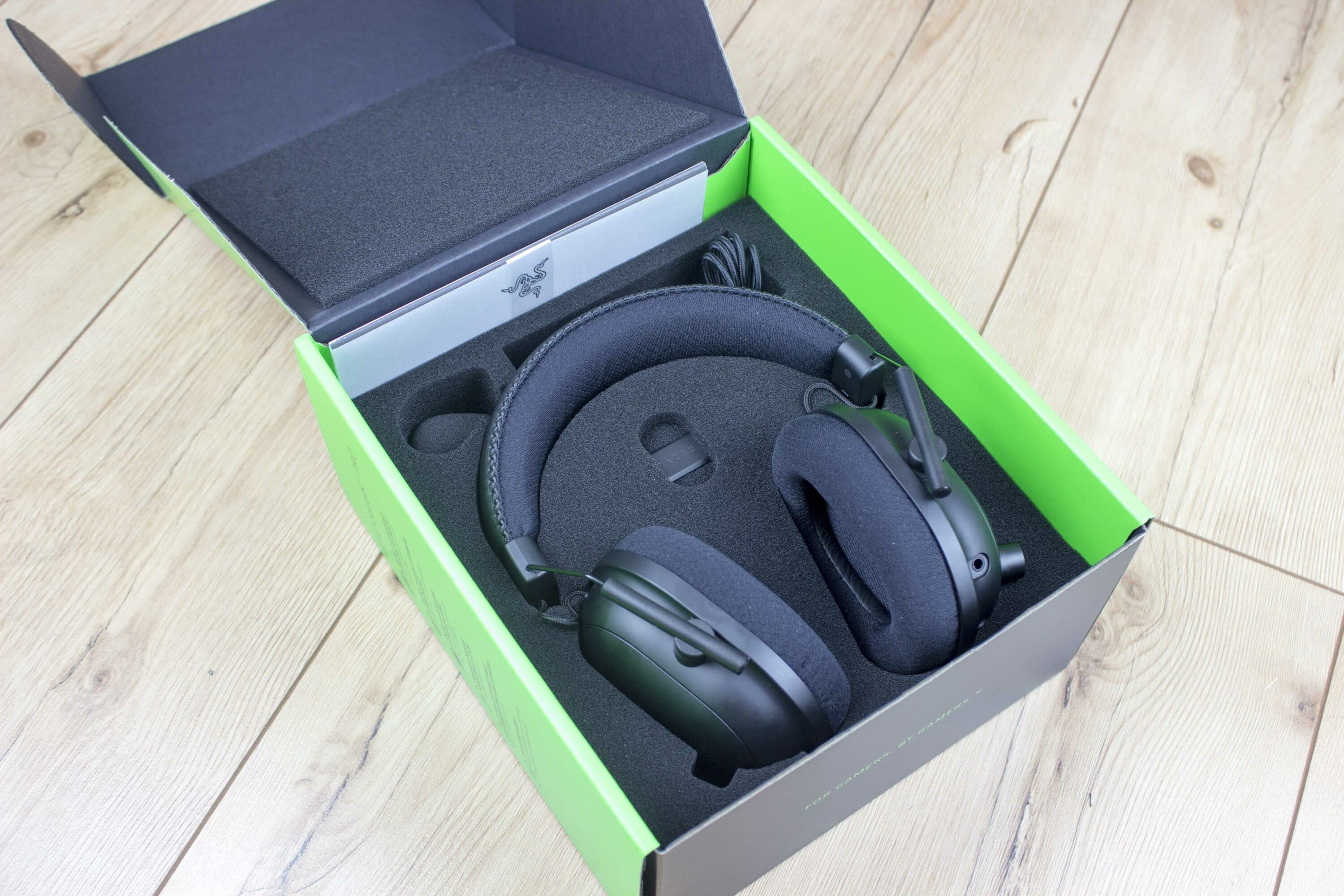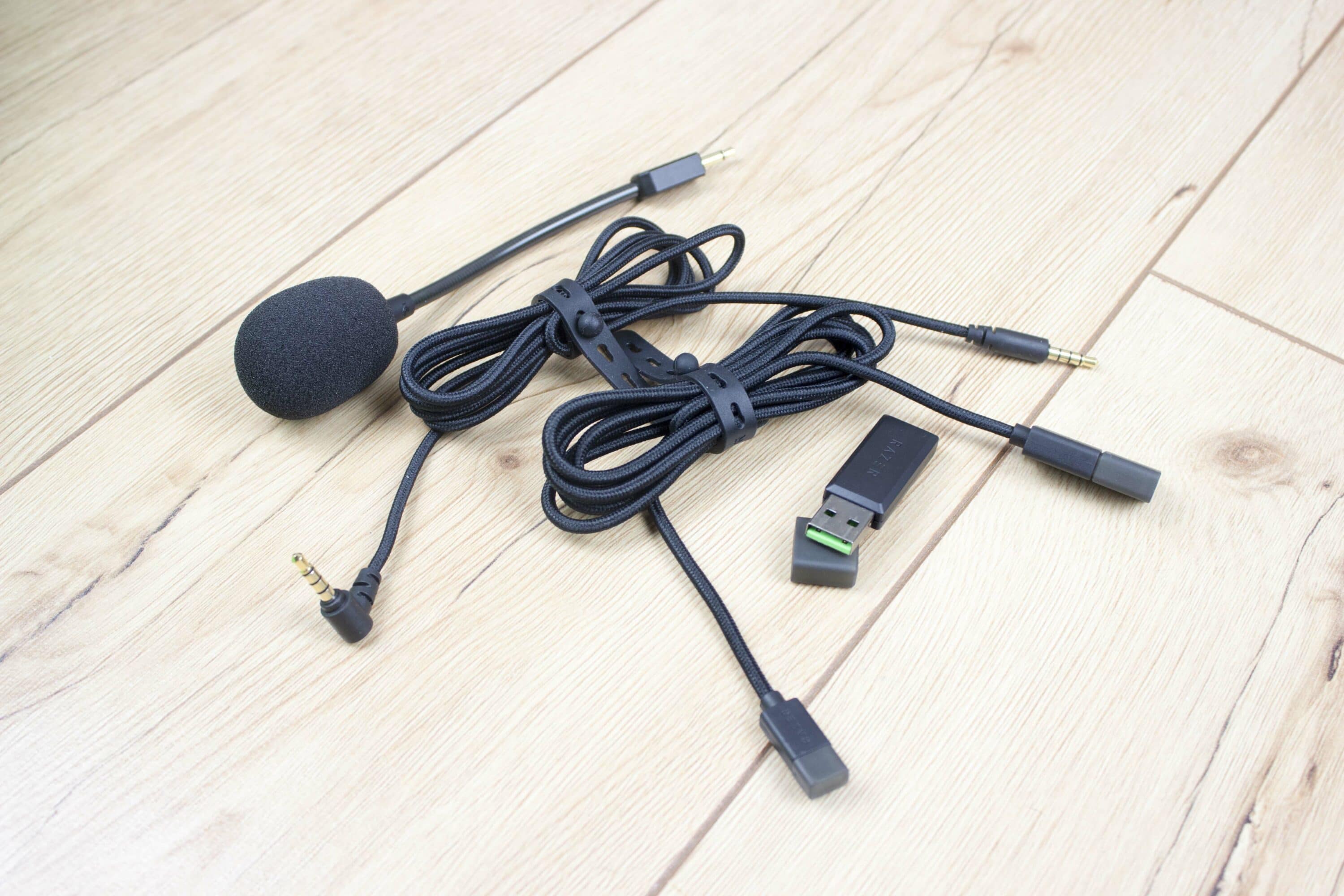 Razer ist wirklich kein Hersteller, der an imposanter Verpackung spart. Das BlackShark V2 ist wirklich gut hergerichtet und kommt mit allerlei Zubehör. Zur Verbindung mit dem PC liegt natürlich ein USB-Empfänger dabei, da das Headset kabellos ist. Möchtet ihr auf ein Kabel aber nicht verzichten oder das Headset auch an der PlayStation oder der Xbox verwenden, liegt ein vierpoliges Klinkenkabel mit dabei. Zum Aufladen des Akkus ist auch ein entsprechend langes USB-Kabel vorhanden.