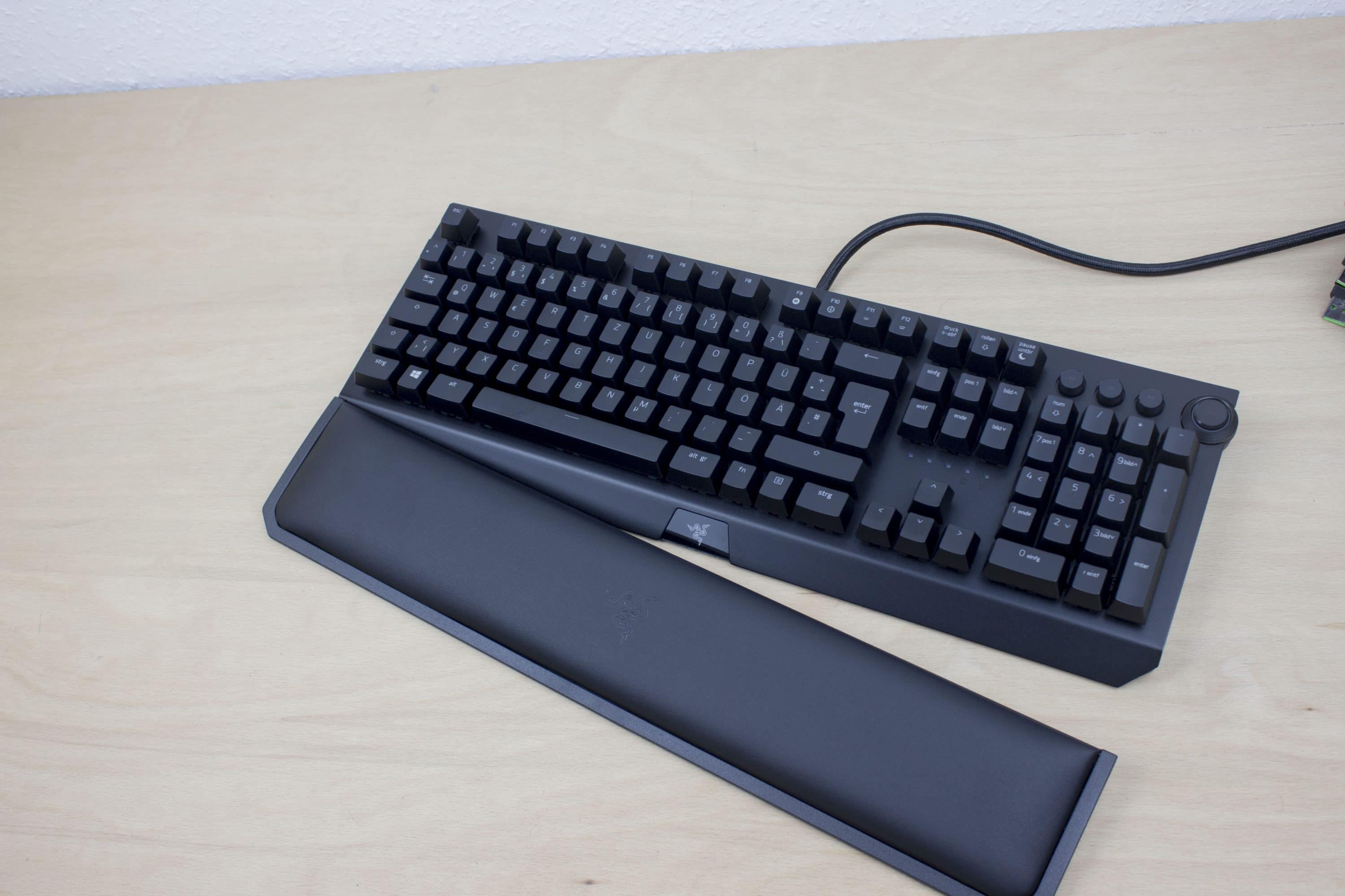 Im Lieferumfang der BlackWidow Elite ist außerdem eine gepolsterte Handballenablage dabei – kann man bei ca. 180 Euro Kaufpreis auch erwarten. Durch die Handballenablage wird, unserer Meinung nach, der Komfort um 110 % gesteigert. Viele Tastaturen haben abnehmbare oder integrierte, fest verbaute Ablagen, keine bietet den selben Komfort wie die von Razer. Selbst lange Session lassen sich so ertragen, ohne das die Handgelenke schwach werden. Zusätzlich ist die Handballenablage nicht an eine feste Position gebunden, denn sie wird magnetisch fixiert. Ihr könnt euch also frei aussuchen, wo sie liegen soll, in welchem Winkel oder vielleicht soll sie auch komplett schräg auf dem Schreibtisch liegen – alles kein Problem!