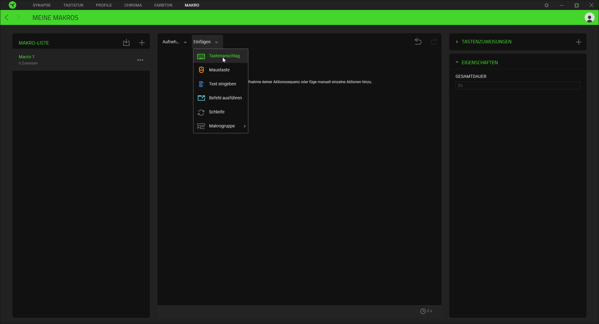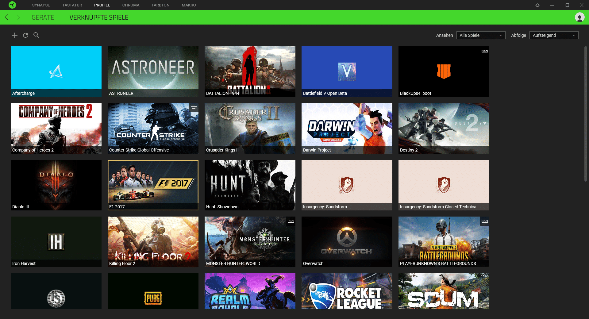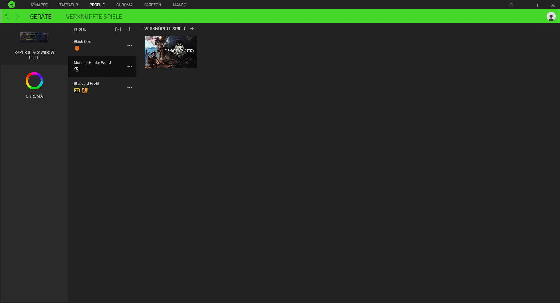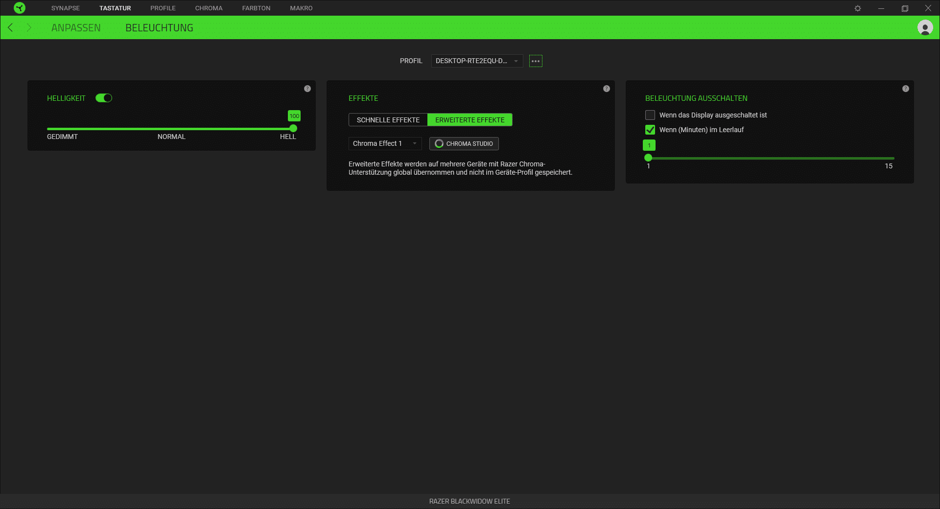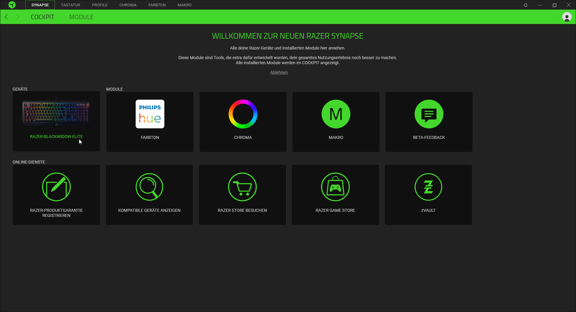 Die Razer „Synapse“-Software ist nur für die BlackWidow Elite geeignet, sondern es lassen sich alle angeschlossenen Razer-Geräte damit verwalten. Jeder, der schon eine Software für seine Tastatur genutzt hat, wird direkt damit klar kommen. Aber auch neue Nutzer werden sich direkt zu recht finden, da „Synapse“ übersichtlich und intuitiv gestaltet ist. Auf der Startseite werden direkt alle verfügbaren Geräte angezeigt und können schnell bearbeitet und angepasst werden.
