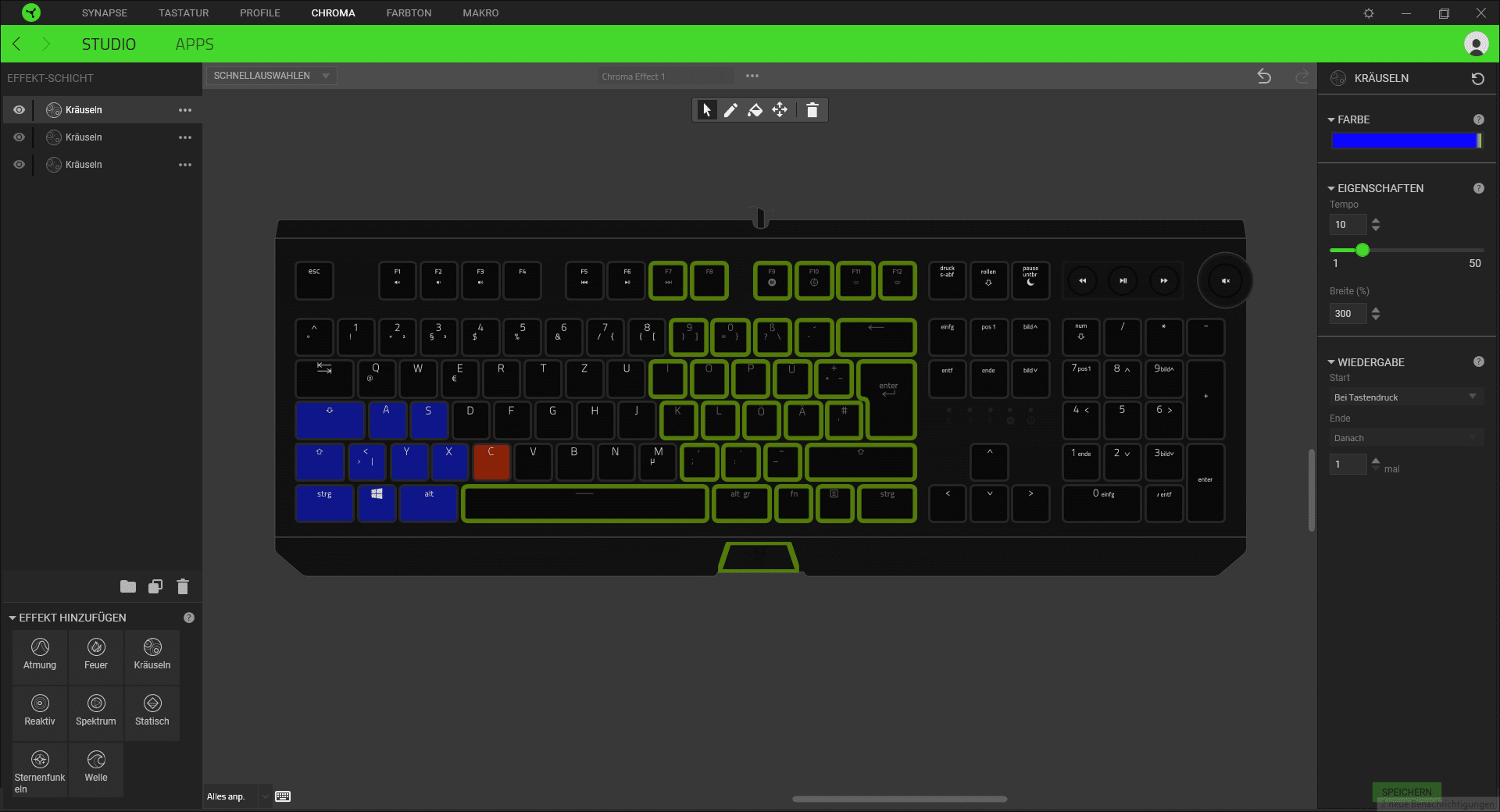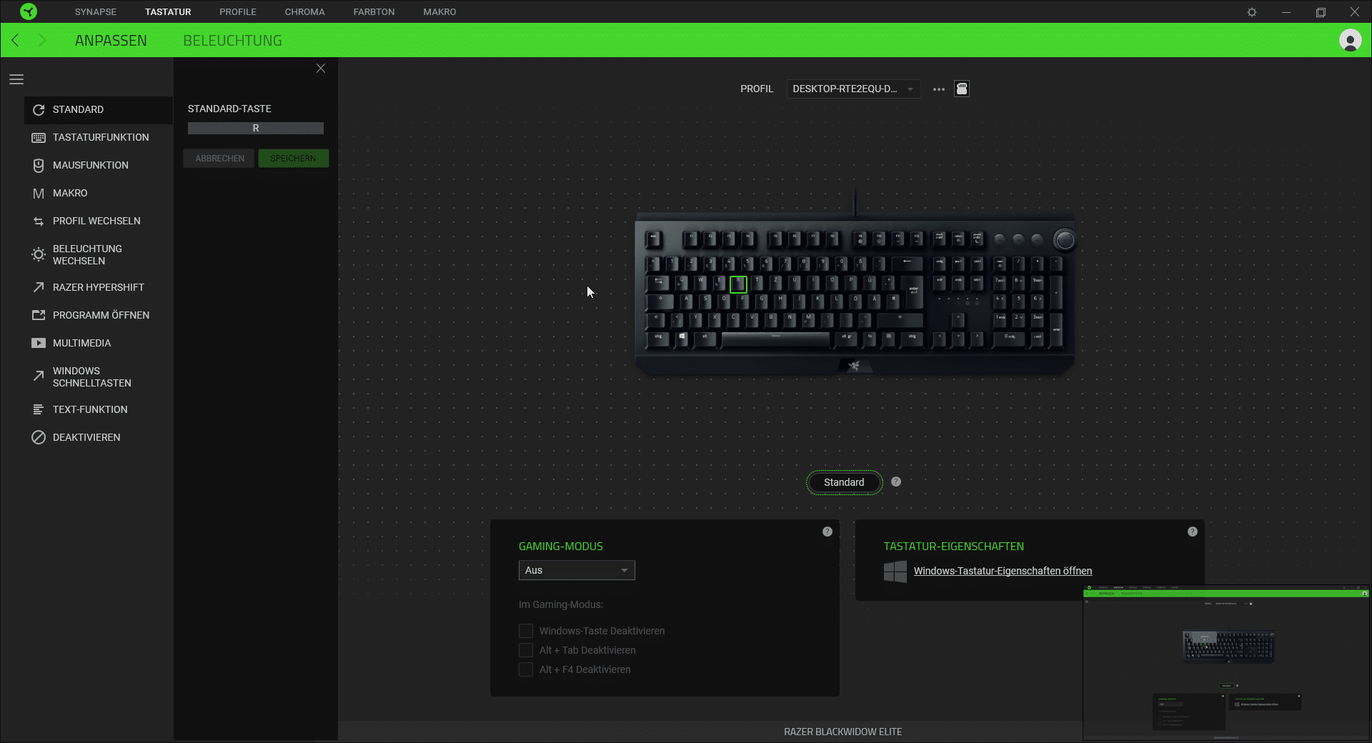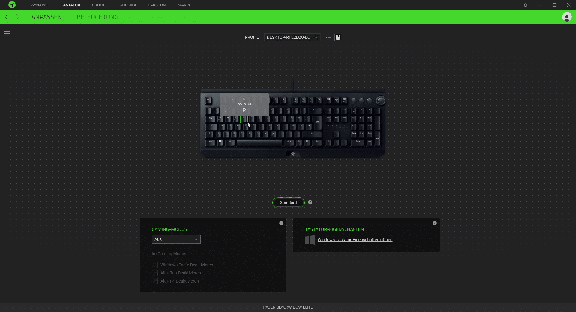 RGB-Beleuchtungen bei Gaming-Tastaturen im höheren Preissegment gehören genau so zusammen wie das Amen in der Kirche. Bei der BlackWidow Elite ist über den Schaltern eine kleine LED angebracht, die die Tastenbeschriftung zum Leuchten bringen. Einen kleinen Pluspunkt gibt es für die gleichmäßige Ausleuchtung der Tasten. Per Software können unzählig viele Farben und Farbvariationen eingestellt werden. Zur Software später noch ein paar Worte.