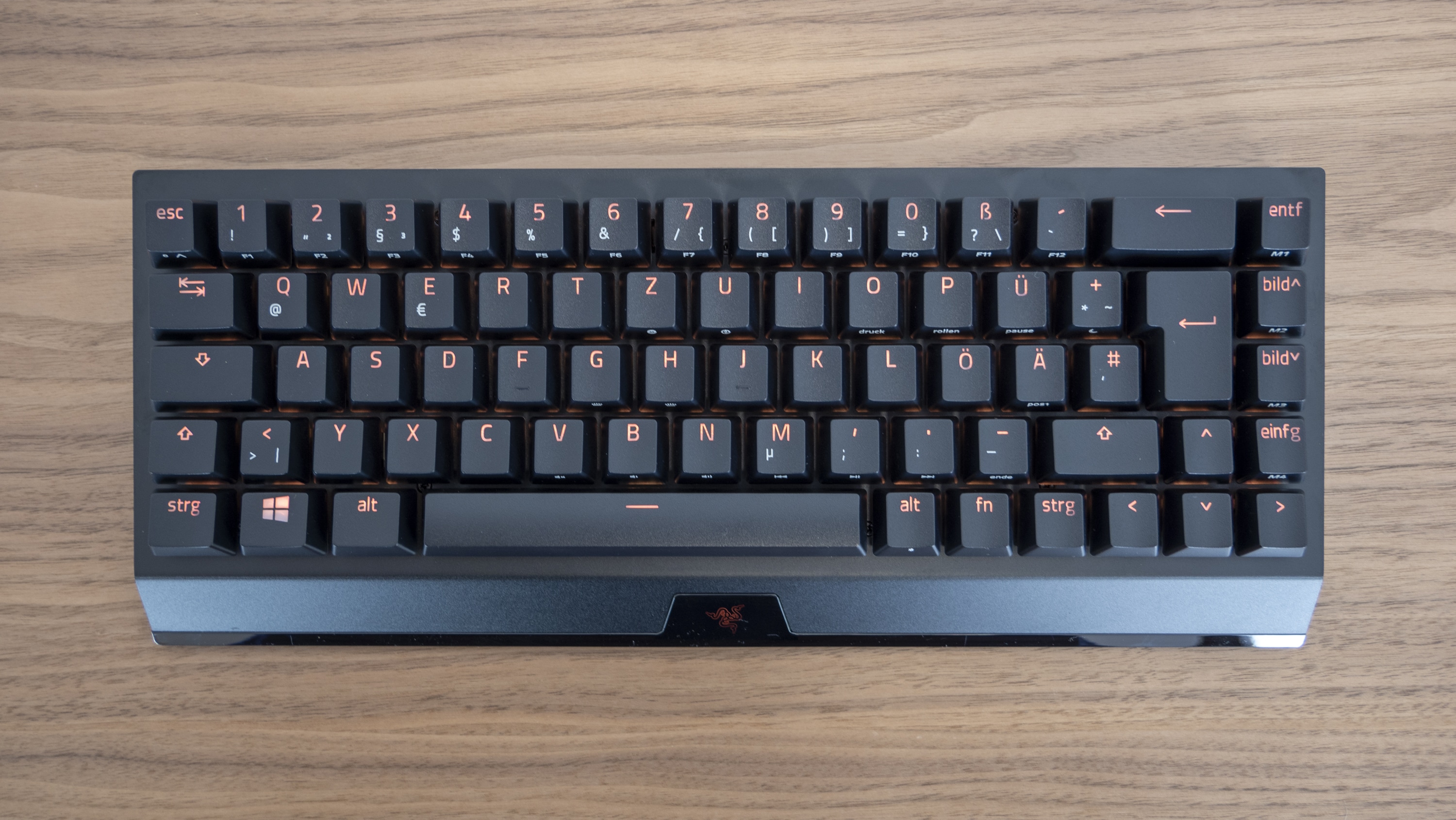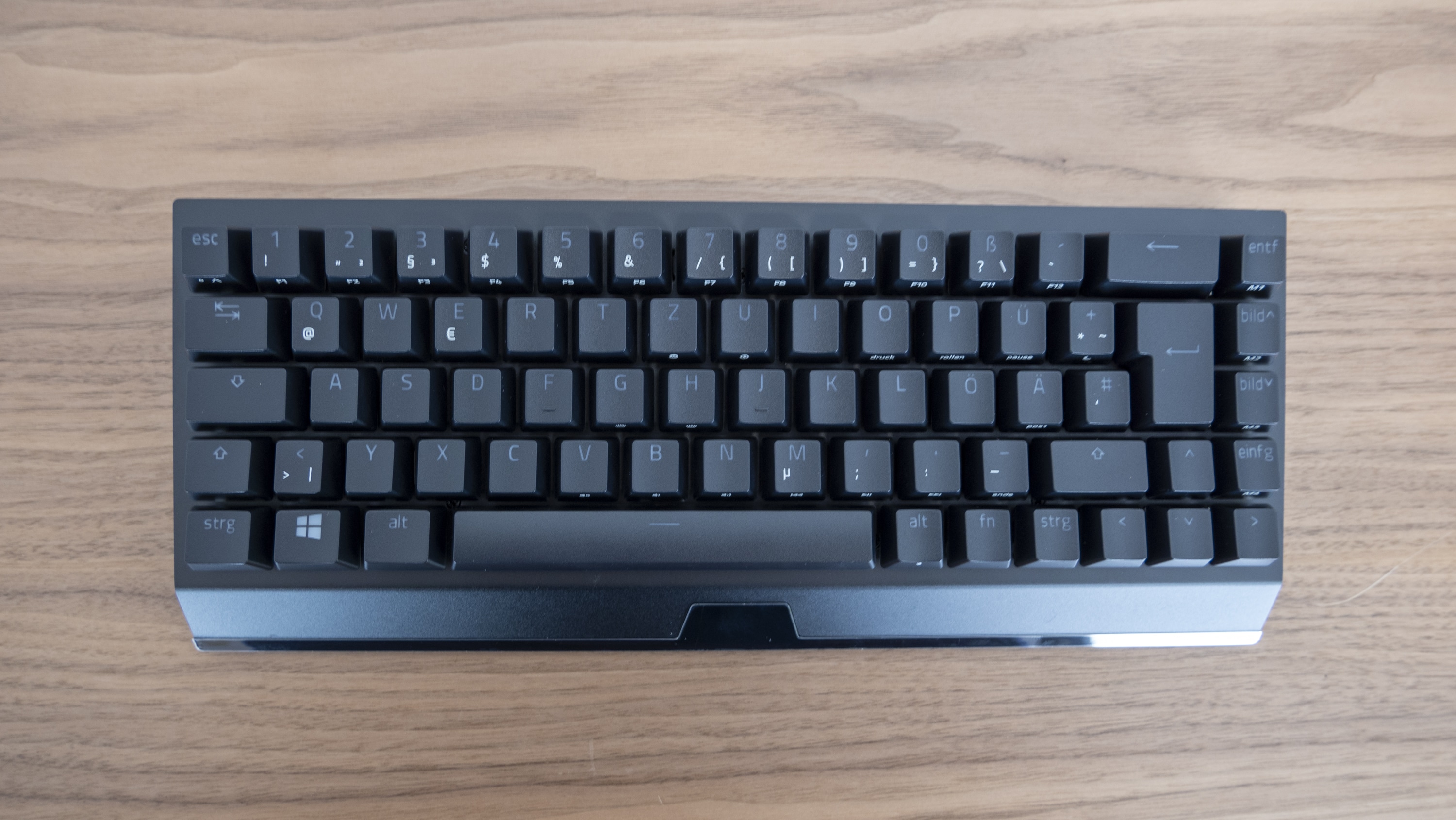 Die Tastatur ist vor allem klein. Auffällig ist jedoch, dass sie sich etwa von der Huntsman Mini dadurch unterscheidet, dass sie nicht auf alle verzichtbaren Tasten verzichtet: Die Pfeiltasten sind im 65-Prozent-Layout enthalten. Auf allen darüber hinausgehenden Luxus verzichtet Razer jedoch, was die Tastatur entsprechend minimalistisch anmuten lässt. Ausgestattet ist Tastatur dabei entweder mit hauseigenen Green- oder Yellow-Switches und einer Chroma-RGB-Beleuchtung. Im Design unterscheidet das Gerät sich – abgesehen von der Größe – damit letztlich kaum von anderen Tastaturen. Dadurch, dass sie sehr zierlich und minimalistisch wirkt, mutet sie jedoch zunächst nicht wie eine Gaming-Tastatur an, sondern eher wie ein Bürogerät. Dass das einige Vorteile mit sich bringt, liegt auf der Hand: Sie kann auch bei kleineren Schreibtischen problemlos zum Einsatz kommen, lässt sich im Zweifelsfalle leichter aus dem Weg räumen und ist ob der problemlosen Transportabilität und des geringen Platzbedarfs wesentlich besser für den Einsatz außerhalb der eigenen vier Wände geeignet.