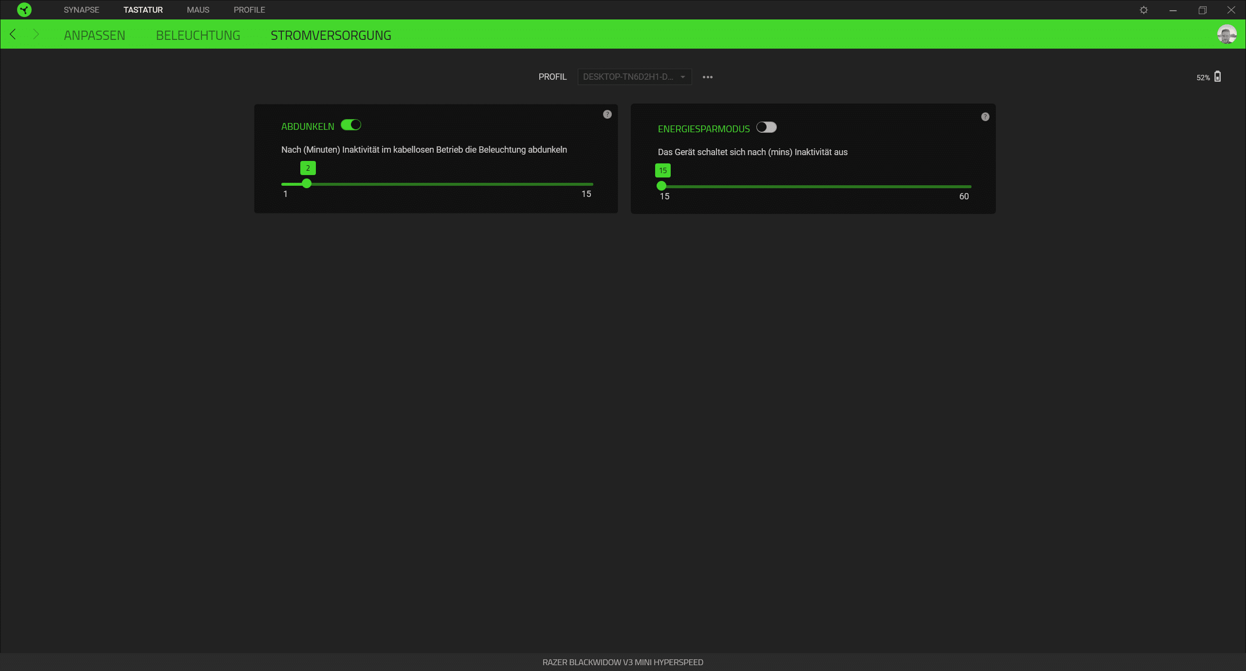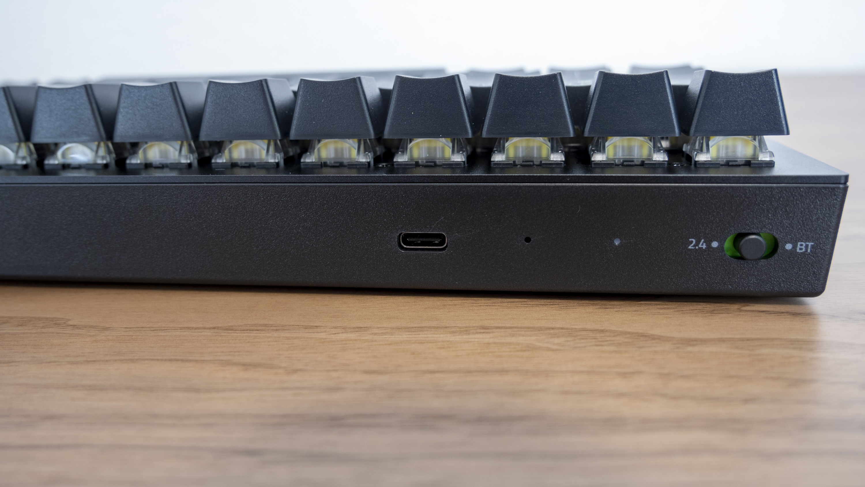 Bei der BlackWidow V3 Mini HyperSpeed handelt es sich um eine per Akku betriebene Tastatur, die entsprechend flexibel eingesetzt werden kann. Aufgeladen wird sie per USB-C-Kabel. Die angegebene Akkulaufzeit von 200 Stunden kann in der Praxis durchaus erreicht werden – nicht jedoch, wenn die RGB-Beleuchtung (die vergleichsweise dunkel ist) verwendet wird. In unserem Praxistest jedenfalls hat eine Akkuladung für einen mehrtägigen intensiven Gebrauch ausgereicht – auch danach war noch mehr als genügend Restvolumen vorhanden. Ist der Akku einmal leer, kann die Tastatur während des Ladevorgangs indes problemlos weitergenutzt werden, sofern sie per USB-C-Kabel an den PC angeschlossen wird, die sie dann während des Betriebs mit Strom versorgt. Kabellos lässt sie sich über eine 2,4-GHz-Funkverbindung sowie über Bluetooth betreiben. Beide Optionen funktionierten in unserem Test tadellos.