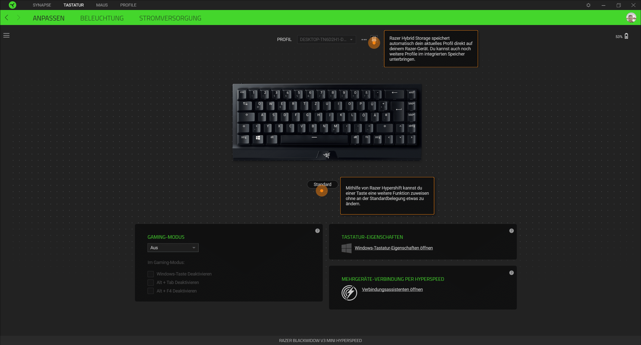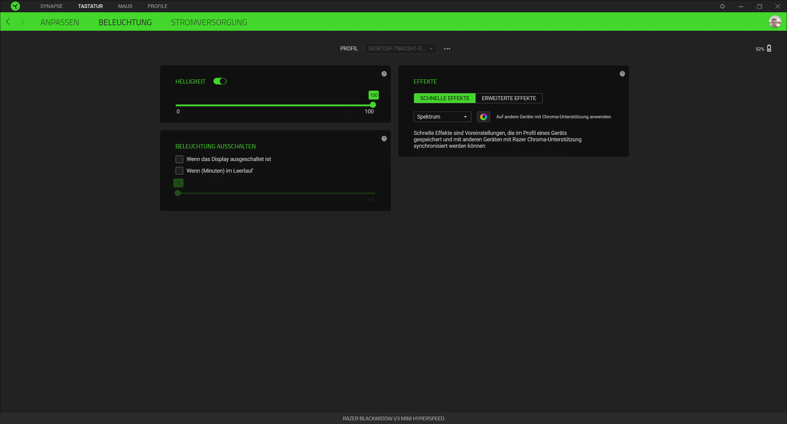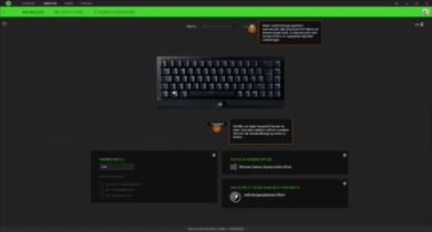 Die bereits erwähnte RGB-Beleuchtung haben wir selbstverständlich auch getestet. Die BlackWidow V3 Mini HyperSpeed bietet zahlreiche Beleuchtungsoptionen, da jede Taste einzeln angesteuert werden kann. In der Konsequenz lassen sich so unterschiedlichste Beleuchtungseffekte erreichen. Über die Chroma-Software, mit der die Beleuchtung gesteuert wird, kann darüber hinaus eine Synchronisierung mit anderen Chroma-Geräten erfolgen. Die Software ist kostenlos erhältlich und bietet eine übersichtliche Auflistung aller Steuerungsoptionen. Neben den Beleuchtungsoptionen finden sich hier etwa auch Möglichkeiten der Makrobelegung sowie der freien Programmierung aller Tasten. Drei Profile lassen sich direkt auf der Tastatur speichern. Das Umschalten zwischen diesen Profilen funktionierte einwandfrei. Die gebotenen Möglichkeiten sind also beinahe grenzenlos, was uns im Test sehr positiv aufgefallen ist. Mit allen Einstellungsoptionen sind wir dabei ohne längere Einarbeitungszeit gut zurechtgekommen.