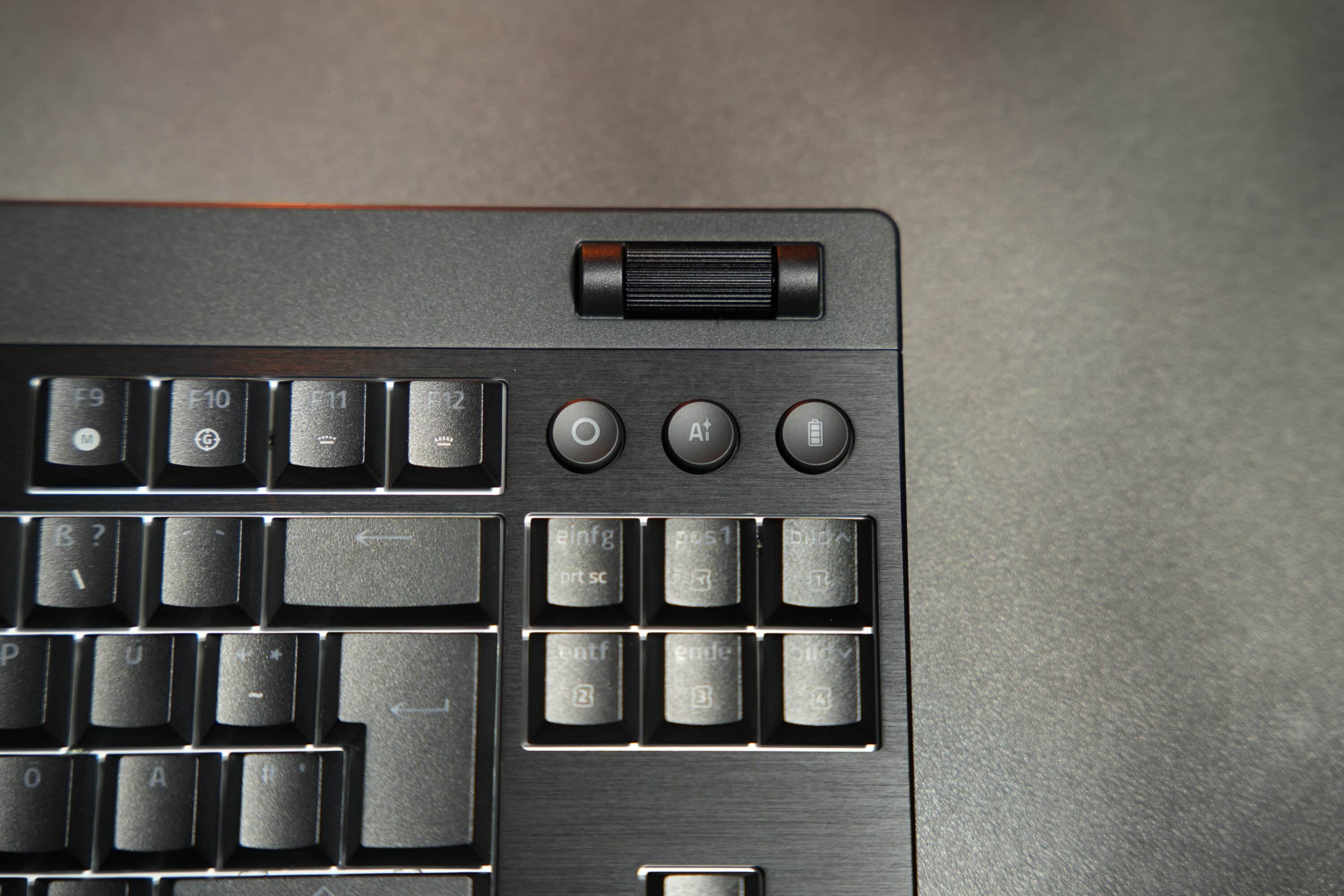 Oberhalb der Tasten zeigt sich das Razer-Logo, unterhalb der Leertaste der Herstellerschriftzug. Auffällig präsentiert sich zudem das Multifunktions-Drehrad, das eine angenehme Maserung aufweist. Darunter, rechts der F-Tastenreihe, legt der Hersteller drei weitere Zusatztasten an: Die linke Taste dient der Mediensteuerung, die mittlere „Ai“-Taste öffnet den Ai Prompt Master (dazu später mehr), während die rechte Taste per Knopfdruck und nachfolgender Beleuchtung der Zahlenreihe über den Ladestand des Akkus informiert.