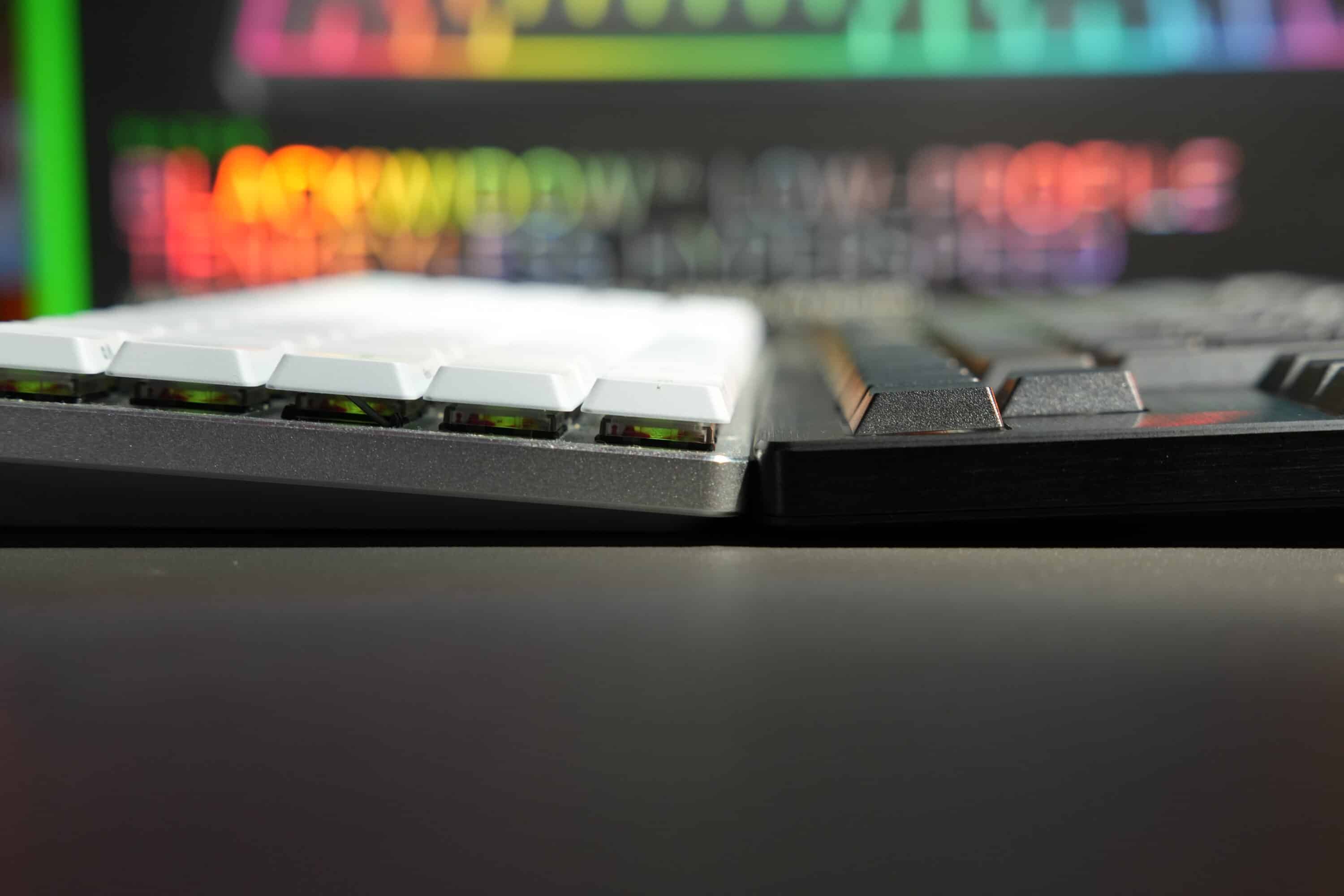 Ich persönlich finde den flachen Charakter sehr ansprechend, wenngleich dies natürlich etwas Ein- beziehungsweise Umgewöhnung nötig macht. Razer-typisch ist die Tastatur, auch aufgrund der taktilen Schalter, jedoch eher laut – das ASUS-Pendant löst merklich leiser aus. Dafür werden Tasteneingaben durch einen zufriedenstellenden Druckpunkt bestätigt.