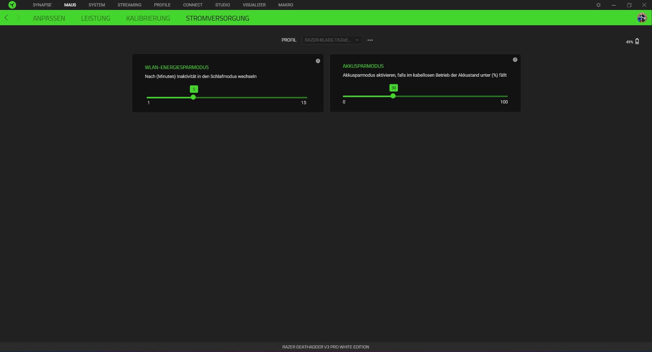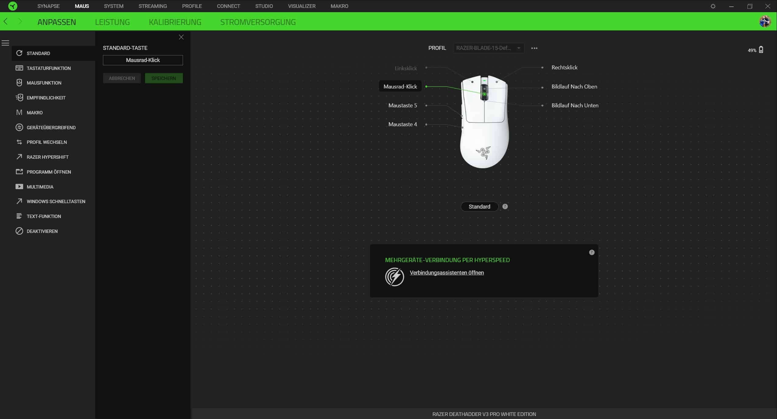 Im Reiter „Leistung“ legst du hingegen die fünf DPI-Stufen fest, die auf den Nager gespeichert werden und zwischen denen du per Knopfdruck hin- und herwechselst. Außerdem kannst du hier die Abtastrate auf 125 Hz, 500 Hz oder 1.000 Hz einstellen. Diese lässt sich auf Wunsch mit dem optional erhältlichen Razer HyperPolling Wireless Dongle zudem auf bis zu 4.000 Hz hochschrauben.