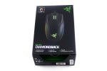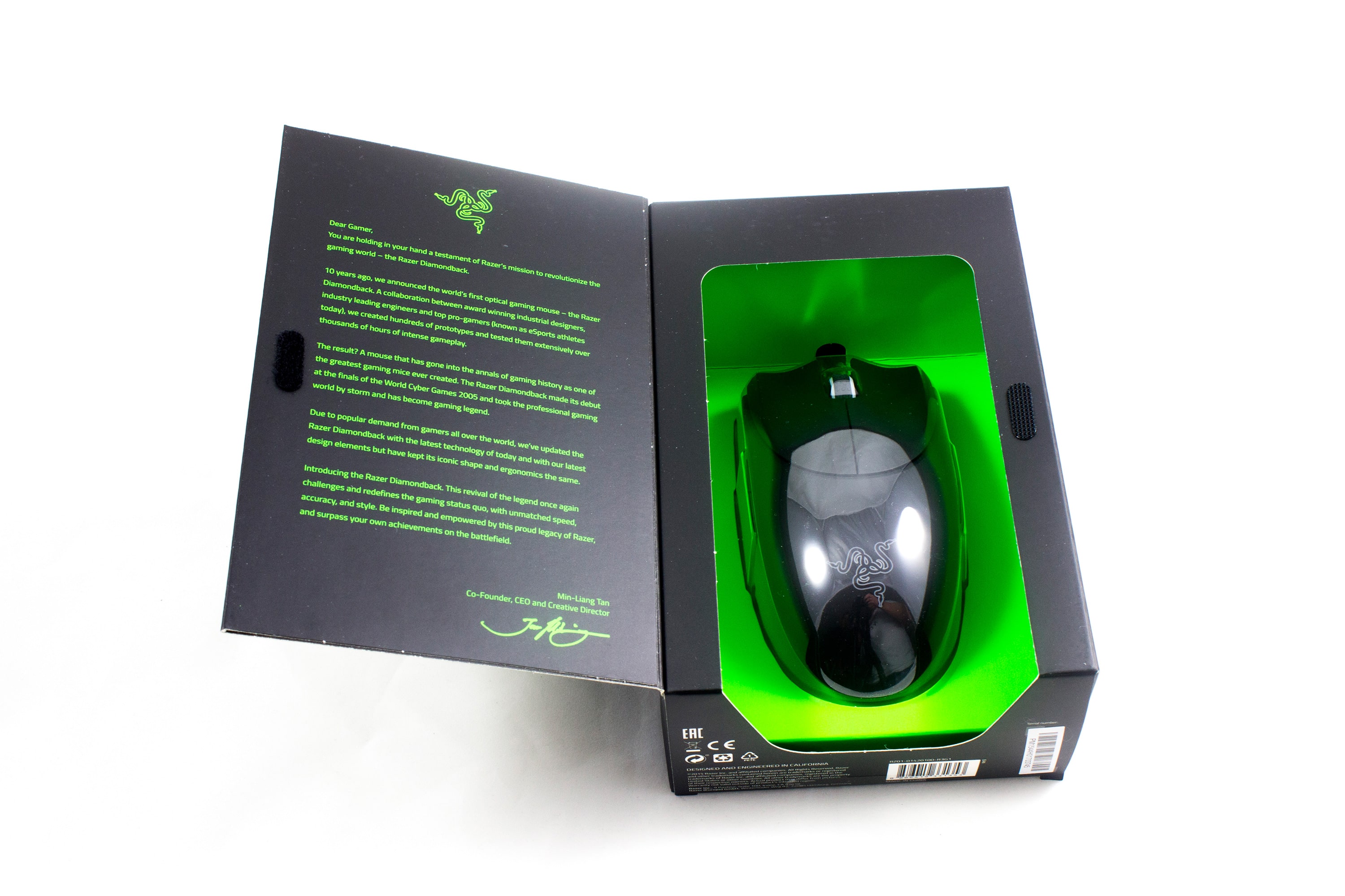 Die Verpackung ist Razer typisch in Schwarz und der Innenraum in Grün gefärbt. Der vordere Deckel kann per Klettverschluss aufgeklappt werden und lässt den Betrachter einen ersten Blick auf die Razer Diamondback werfen. Der Maus liegen noch ein Handbuch, sowie die Razer typischen Aufkleber mit dem Razer Logo bei.