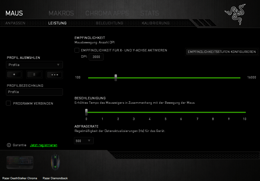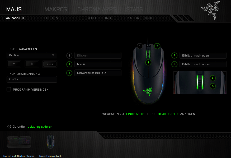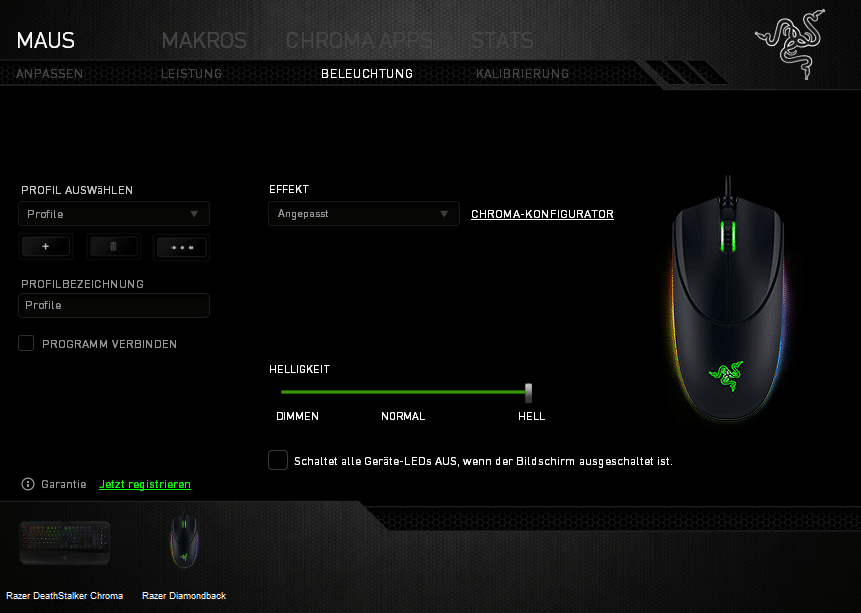 Wie auch im Test der DeathStalker Chroma Tastatur erwähnt, ist die Razer Synapse Software umfangreich genug um einen eigenen Artikel erhalten zu können. Hier beziehen wir uns jedoch nur auf die Features der Maus. In der Software kann man sich eine visuelle Darstellung der Mausbewegungen anzeigen lassen. Zudem ist es möglich den 16.000 DPI starken Maussensor frei einzustellen und bei Wunsch sogar die X-Achse von der Y-Achse abkoppeln und diese separat einzustellen. Bei der Individualisierung der Beleuchtung setzt euch Razer keine Grenzen. Dank Chroma-LEDs kann jeder nur erdenkliche Farbton angezeigt werden. Es können die Logo-LED, die Mausrad-LED und der Stripe um die Maus individuell eingestellt werden. Als Darstellungsmodi stehen einem die Modi „Breathing“, „Wave“ und „Static“ zur Verfügung. Im Modus „Breathing“ werden die LEDs bis zu einem definierten Maximalwert heller und dunkeln sich daraufhin wieder ab. „Wave“ führt dazu, dass die LEDs von einem Farbwert in einen anderen überlaufen und dies über die Maus in Form einer Welle verbreitet wird. Static ist, wie es wahrscheinlich die meisten erraten haben, einfach der statische Farbmodus, in welchem die gewählten Farben permanent ohne Veränderung dargestellt werden. Zudem ist es noch möglich, Makros, welche in der Razer Synapse 2.0 Software erstellt wurden, Hardware übergreifend zu verwenden. Wenn ihr also andere Razer Hardware besitzt, könnt ihr deren Makros auch mit der Maus nutzen und so zum Beispiel Tastatur-Makros auf eine der 4 Seitentasten der Maus legen.