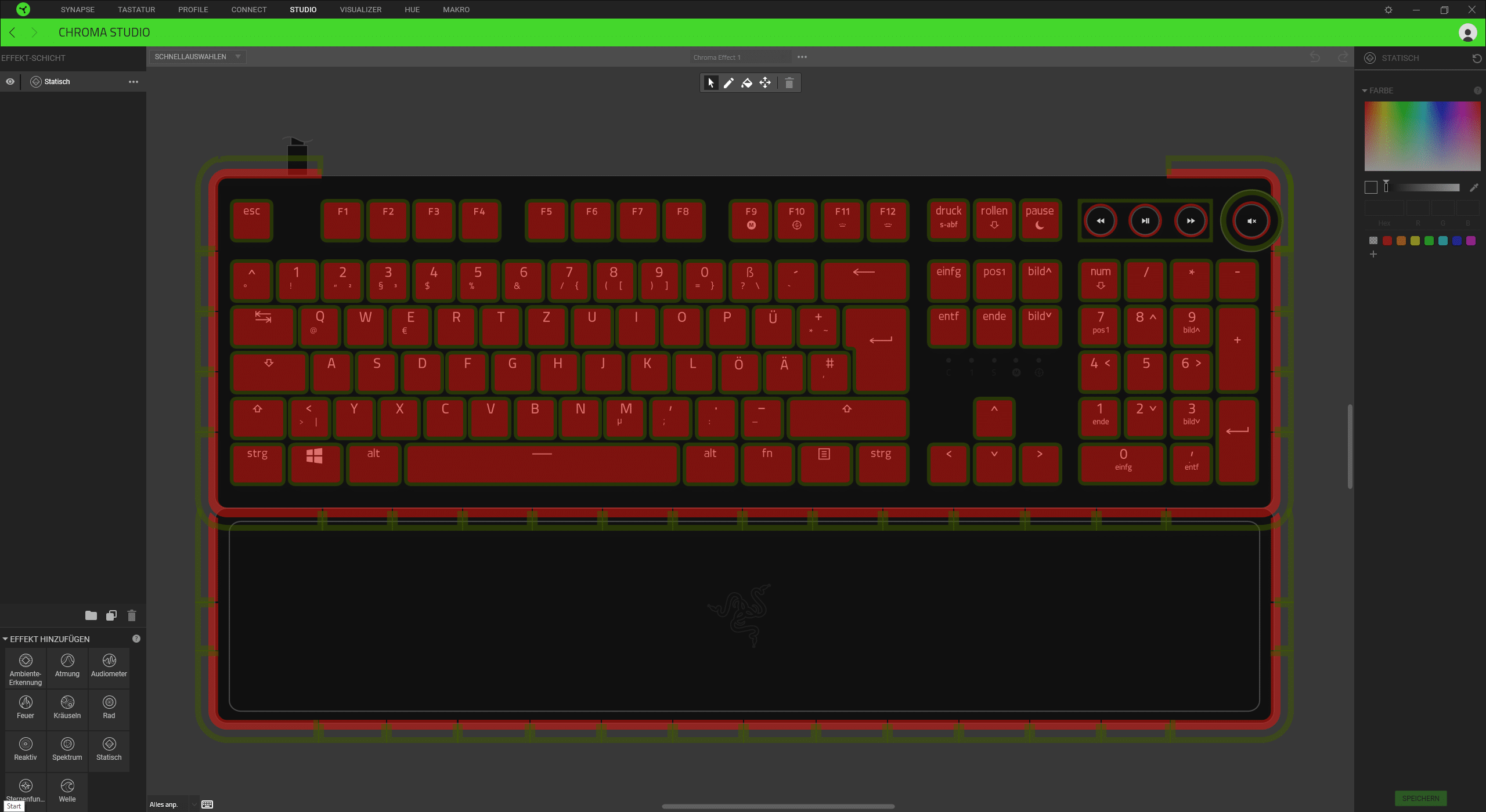 Nicht zu verachten sind natürlich auch die die Beleuchtungsmöglichkeiten bei Razer-Tastaturen, die wir über die Software einstellen können. Im Falle der Razer Huntsman V2 Analog ist nämlich auch die Handballenablage beleuchtet. Wir haben diverse Effekte zur Auswahl und können dabei jede beliebe Farbe einstellen. Die Beleuchtung um die Tastatur herum ist in Zonen aufgeteilt und jede einzelne davon kann individuell beleuchtet werden.