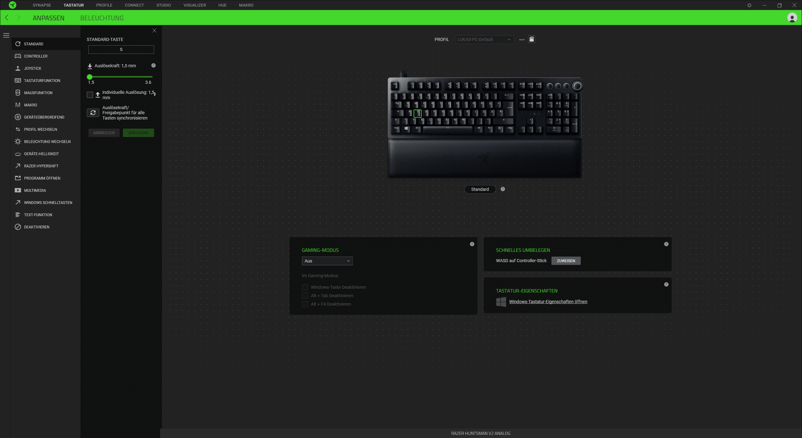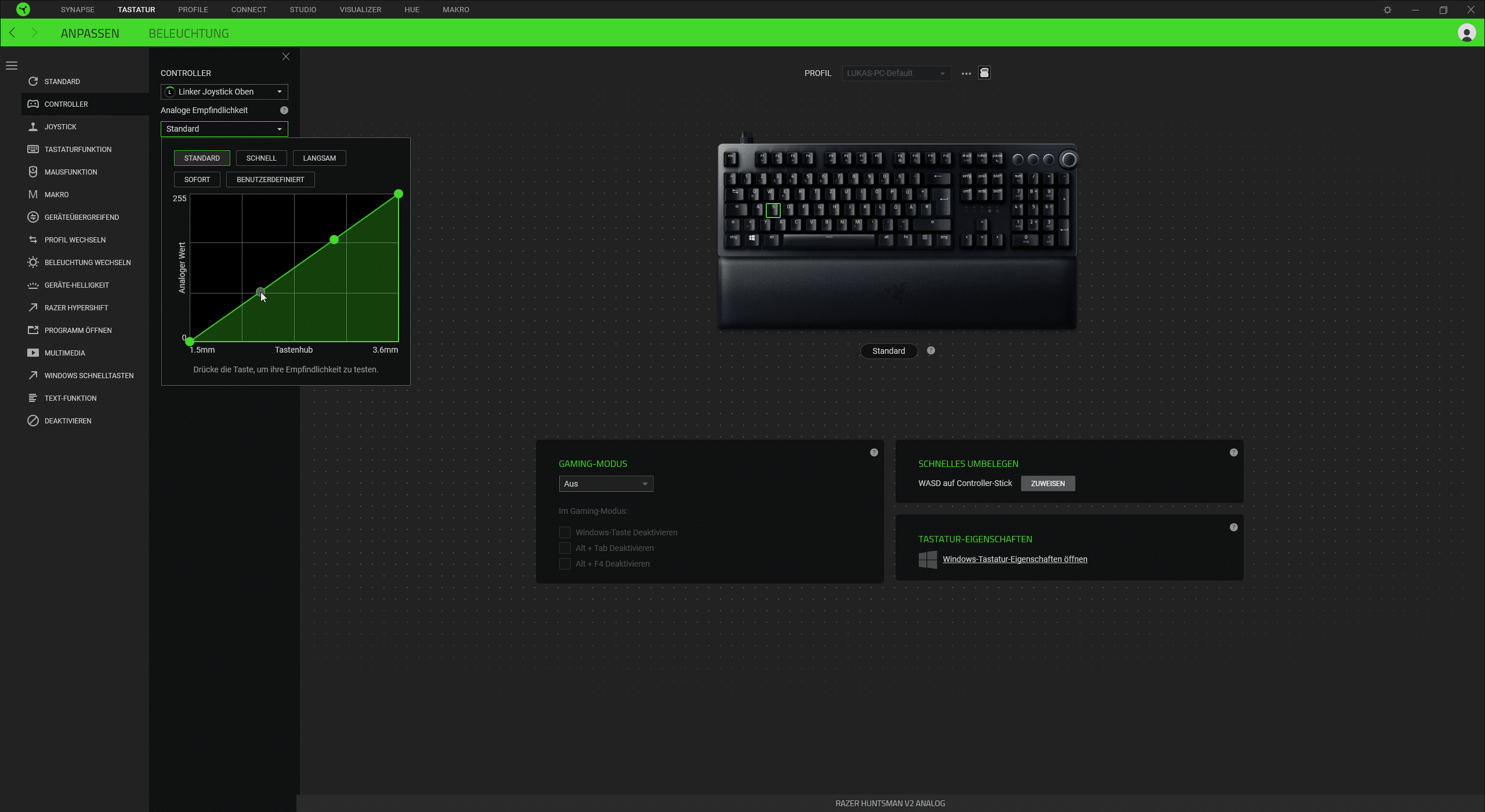 Viel wichtiger ist in diesem Fall aber die Tastenbelegung. Da Razer uns mit der Huntsman V2 Analog den Controller ersparen möchte, haben wir die Möglichkeit Controller-Buttons und -Sticks auf Tasten legen können. Und viel wichtiger ist die einstellbare Empfindlichkeit. Für Rennspiele lohnt es sich beispielsweise die Lenkung auf WASD zu legen, inklusive Gas geben und bremsen natürlich. Nun könnt ihr mit der Empfindlichkeit rumspielen, um die perfekten Einstellungen für euch zu finden.