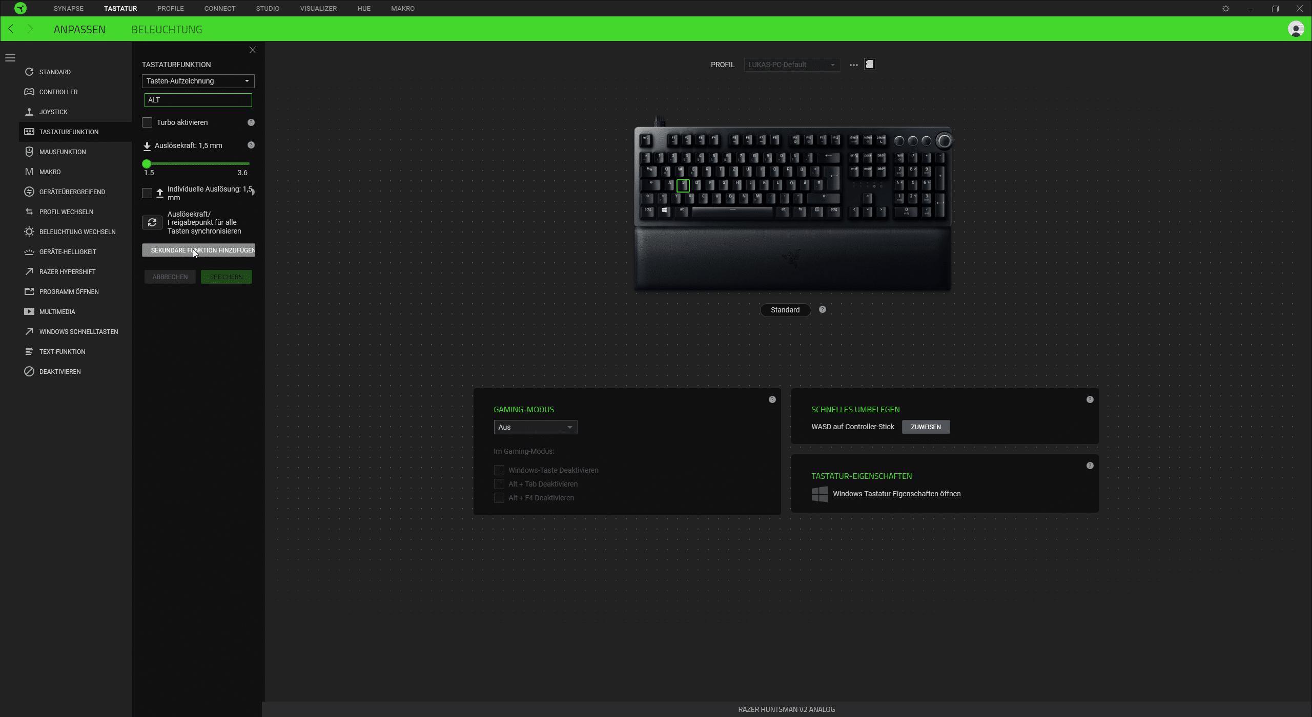 Neben der Belegung für Controller oder Joysticks ist auch die „sekundäre Tastenfunktion“ interessant. Durch die anlogen optischen Schalter könnt ihr festlegen, dass ab einem bestimmten Auslösepunkt, eine zweite Funktion auf einer Taste ausgelöst wird – und das kann wirklich jede andere Taste sein.