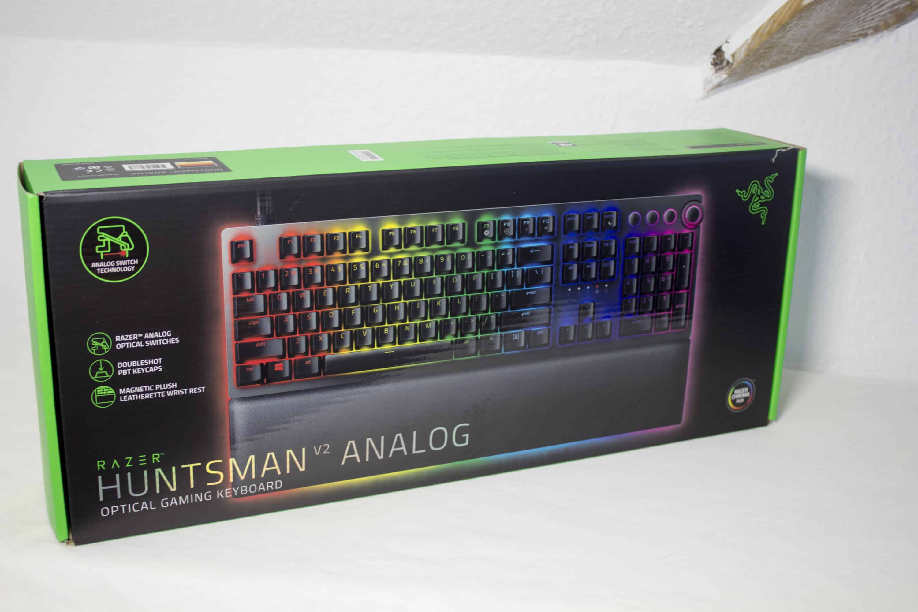 Ihr hattet bereits ein Razer-Produkt? Dann wisst ihr auch, wie hochwertig die Verpackung ist. Das ist auch bei der Huntsmann V2 Analog der Fall. Obwohl die Tastatur nicht wirklich hoch ist, ist der Karton wirklich riesig. Das liegt nicht zu guter Letzt daran, dass unser neuer „Controller-Ersatz“ gut gesichert in hartem Schaumstoff mit einer Kunstoffabdeckung schlummert.