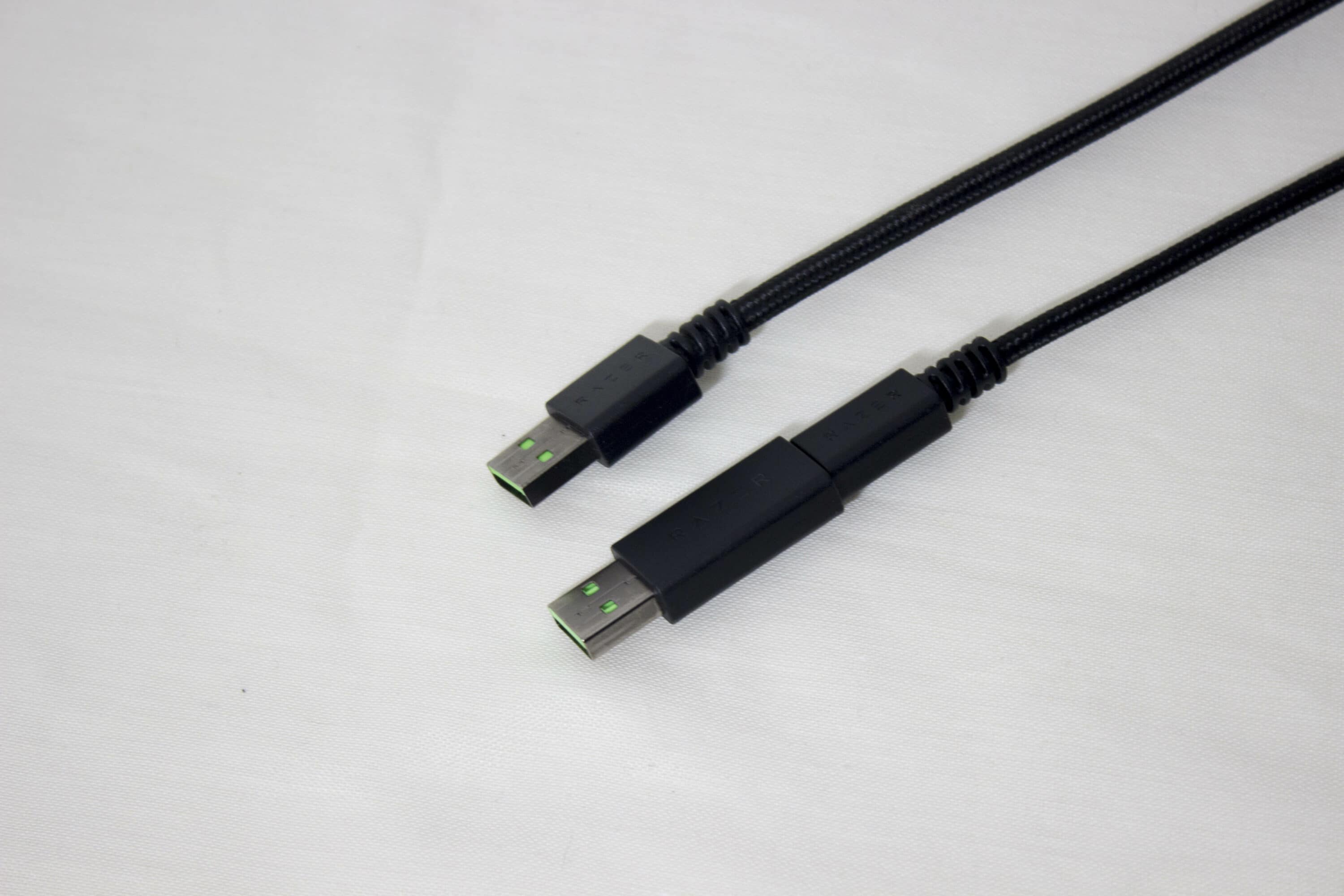 Und es gibt eine weitere designtechnische Entscheidung, die wir bemängeln müssen. Die Huntsman V2 Analog wird per USB-C (USB-A per Adapter) angeschlossen, für den USB-3.0-Pass-Through ist ein weiteres USB-A-Kabel an der Tastatur angebracht. Warum sind zwei einzelne Kabel an der Huntsman angebracht und nicht ein dickes? Vielleicht wären auch abnehmbare Kabel sinnvoll, die kommen immer mehr in Mode. Solltet ihr den USB-Pass-Through nicht benötigen, habt ihr also zwei Kabel auf dem Schreibtisch liegen.