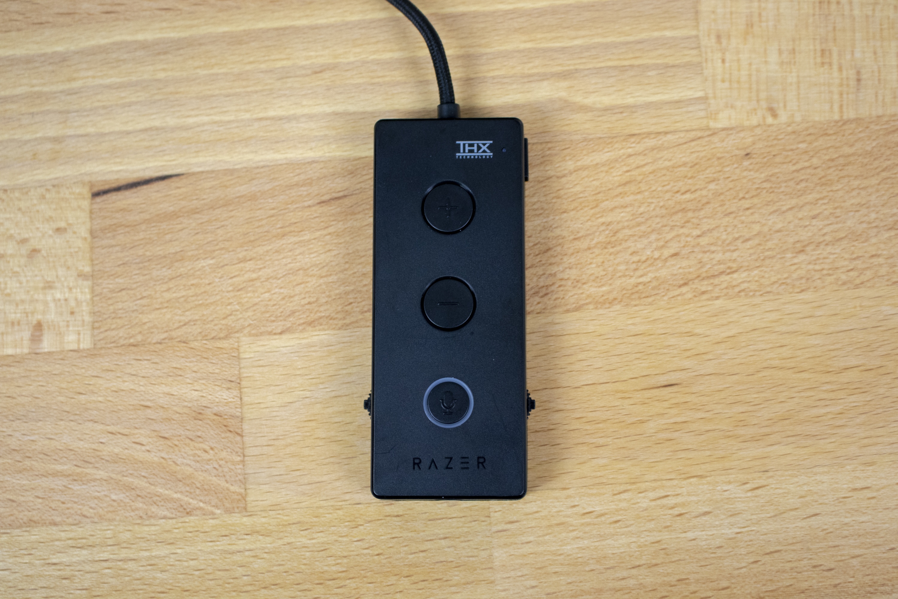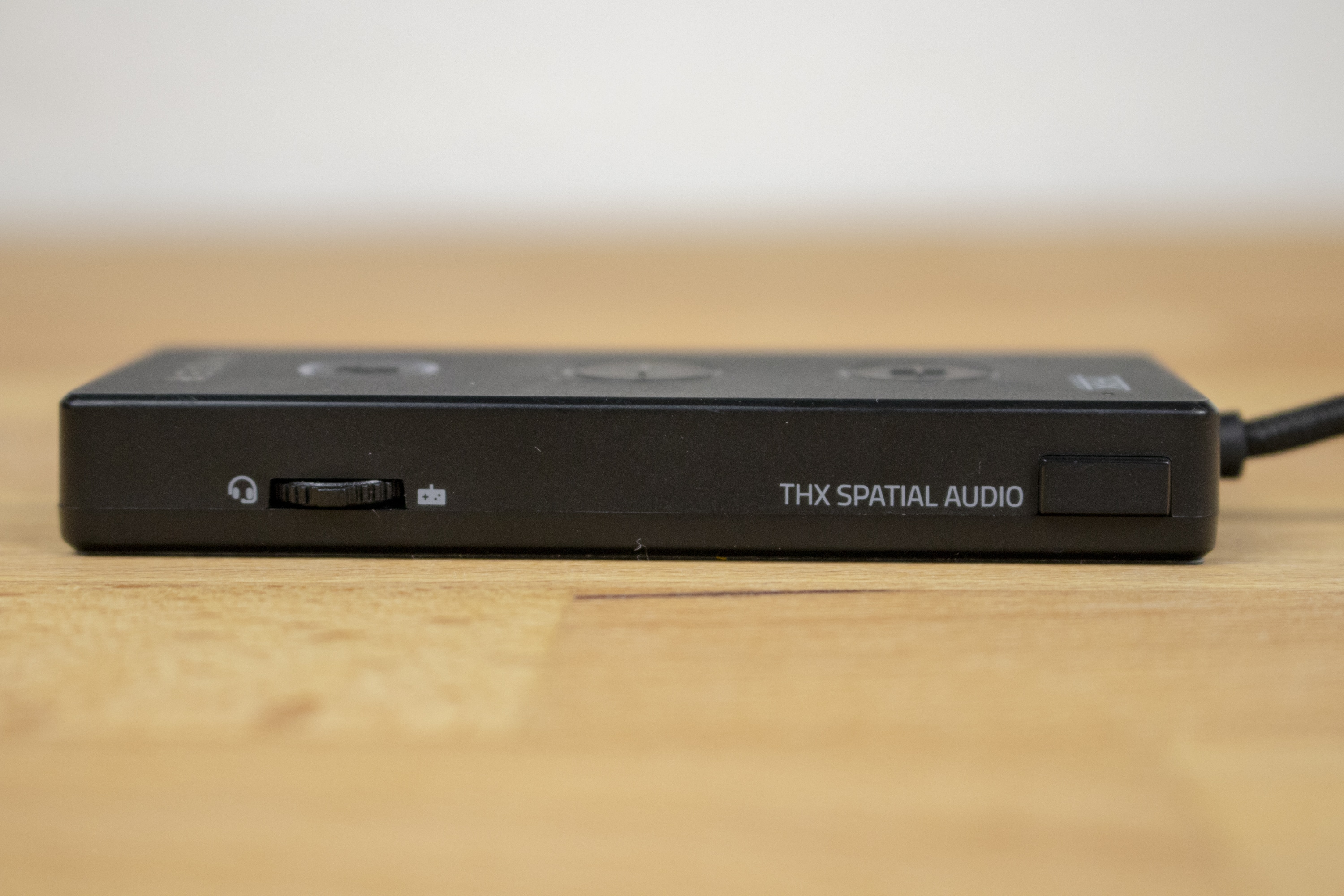 Auf der beiliegenden Bedienungseinheit, über die das Headset mit dem Ausgabegerät verbunden wird, besteht die Möglichkeit, THX-Spatial-Audio per Knopfdruck ein- und auszuschalten. Die Steuerung des Sounds ist also ohne jedes Problem möglich. Weiterhin dient das Gerät dem An- und Abschalten des Mikrofons sowie der Lautstärkeregelung. Das Klinkenkabel des Headsets kann mit dem Steuerungsgerät verbunden werden, welches wiederum per USB-Kabel mit dem Ausgabegerät verbunden wird. Es besteht auch die Möglichkeit, das Headset direkt mit dem Ausgabegerät zu verbinden – hierbei fällt der THX-Spatial-Sound weg.