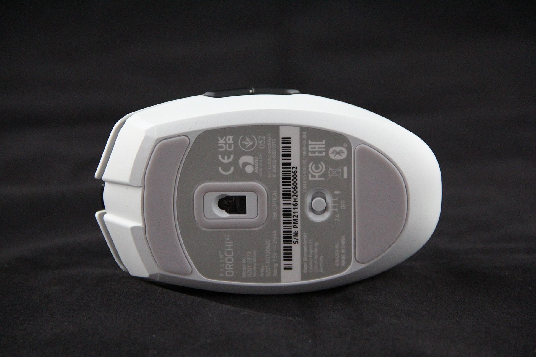 Die Orochi V2 setzt auf ein unauffälliges, schlichtes Design. Die Oberfläche der Orochi V2 White Edition ist, getreu dem Namen, komplett in einem matten Weiß gehalten. Die beiden seitlichen Tasten und der Mittelteil mit dem Mausrad und einer Zusatztaste sind schwarz. Unterhalb der mittleren Tasten befindet sich eine kleine LED-Leuchte. Außerdem ziert das Razor-Logo die Oberfläche. Auf der Unterseite findet sich der Schalter zum Ausschalten der Maus, sowie zum Einschalten der 2,4-GHz-Wireless- oder Bluetooth-Verbindung.