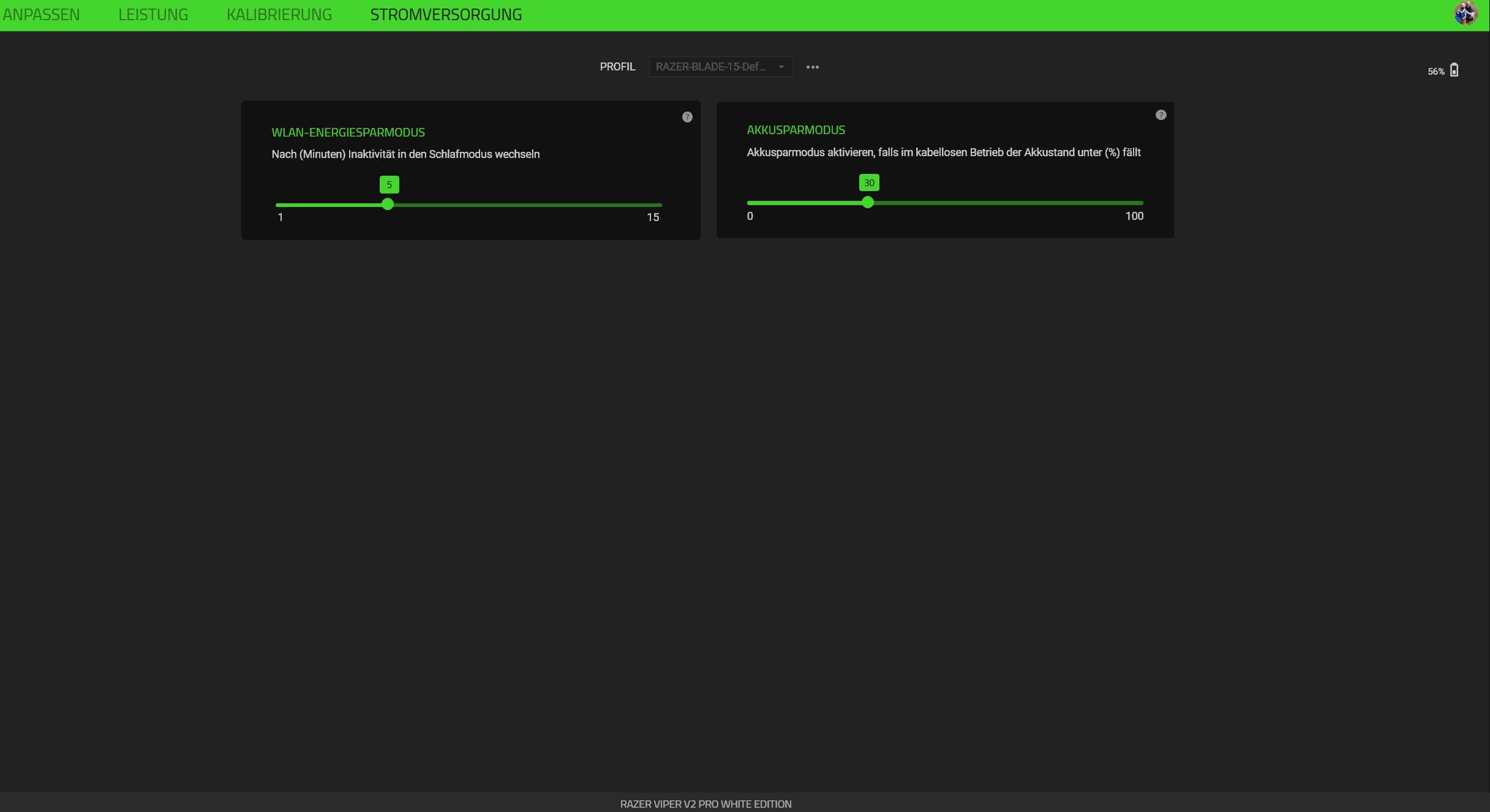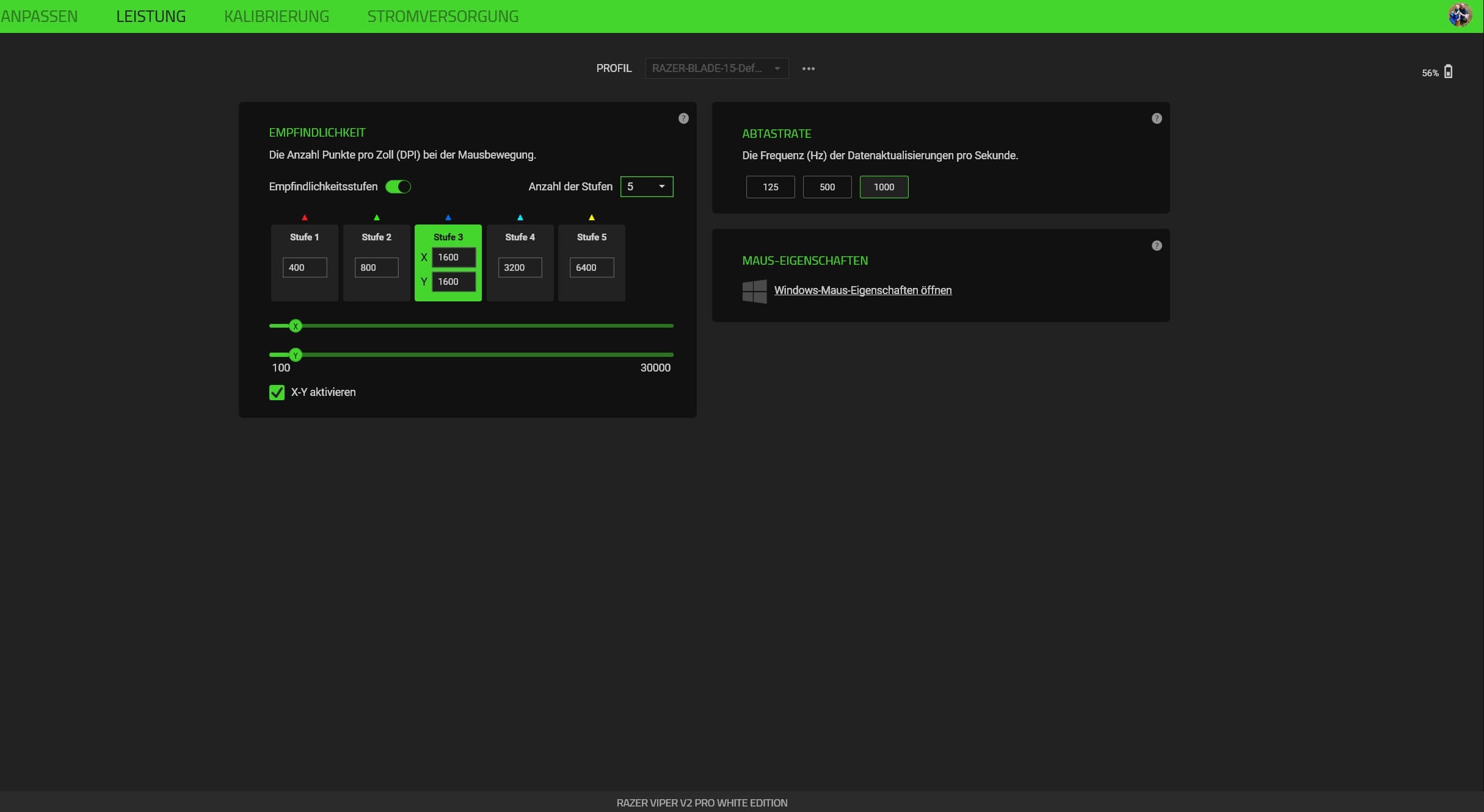 Im Bereich „Leistung“ passt ihr die fünf einstellbaren DPI-Stufen, wahlweise auch in der X- und Y-Achse getrennt voneinander, sowie die Abtastrate an. Außerdem kann das Smart Tracking eingestellt und festgelegt werden, wann sich die Maus bei Inaktivität schlafen legen (zwischen 1 Minute und 15 Minuten) und wann sie in den Energiesparmodus wechseln (zwischen 1 Prozent und 100 Prozent) soll.