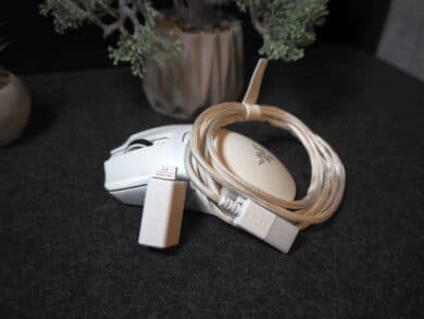 Weiterhin liegt der V2 Pro ein Set aus Maus-Grip-Tape bei, mit dem sich auf Wunsch die Griffigkeit für besonders hitzige Gefechte verbessern lässt. Ein 2,4-GHz-Wireless-Empfänger mit USB-A-Anschluss und ein USB-A- auf USB-C-Dongle-Adapter runden den Lieferumfang ab.