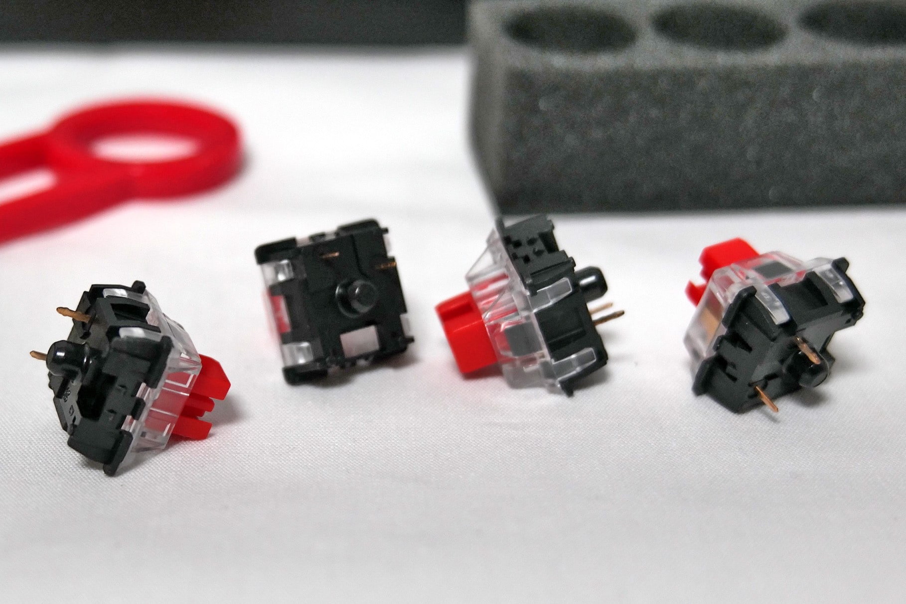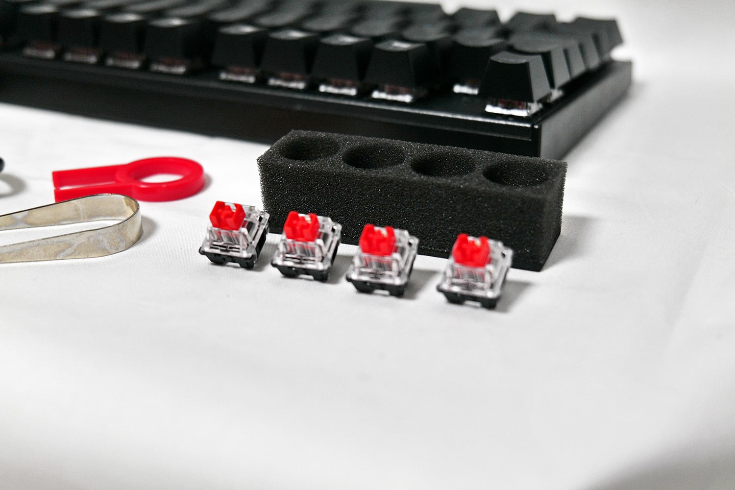 Der Verpackung liegen vier Ersatz-Schalter bei, welche sich dank der mitgelieferten Werkzeuge in wenigen Schritten austauschen lassen sollen, ohne die Tastatur dafür öffnen oder den Lötkolben ansetzen zu müssen und das sogar im laufenden Betrieb.