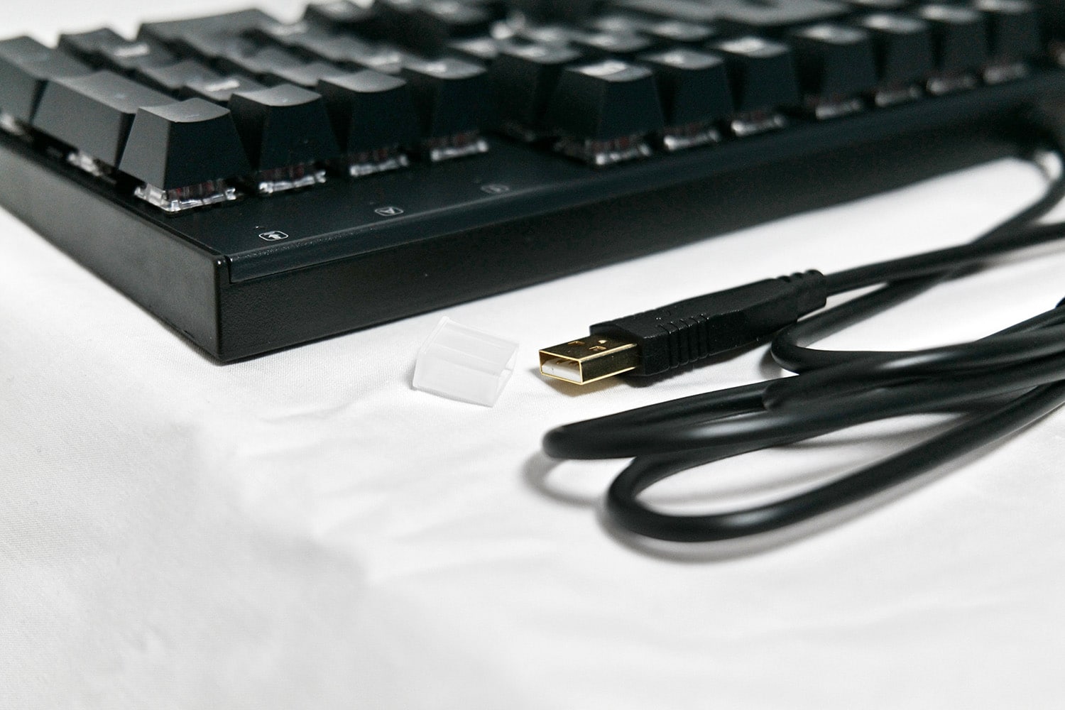 Beim ca. 1,60m langen Kabel der K565 vermissen wir eine in dieser Hardware-Kategorie mittlerweile häufig verwendete Umhüllung mit einem Nylongeflecht, welches dessen Gleitfähigkeit deutlich verbessern würde. Der USB-Anschluss ist vergoldet und besitzt das Format Typ A.