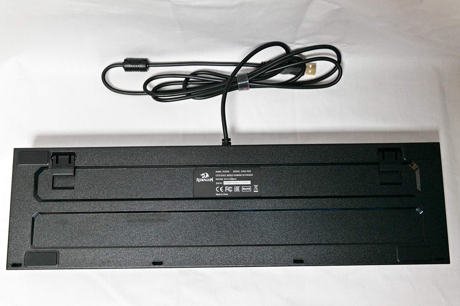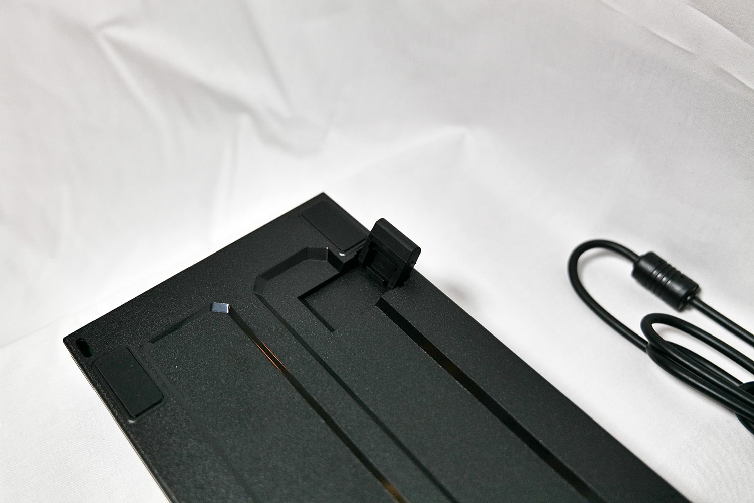 Auf der Gehäuseunterseite befinden sich vier rutschfeste Standfüße plus nochmal zwei ausklappbare, zur Verbesserung der Ergonomie. Die Tastatur ist laut Hersteller staub- und spritzwassergeschützt. Die Metallplatte trägt zur Stabilität der Tastatur bei, jedoch auch zum relativ hohen Gewicht von 1,16 Kg.