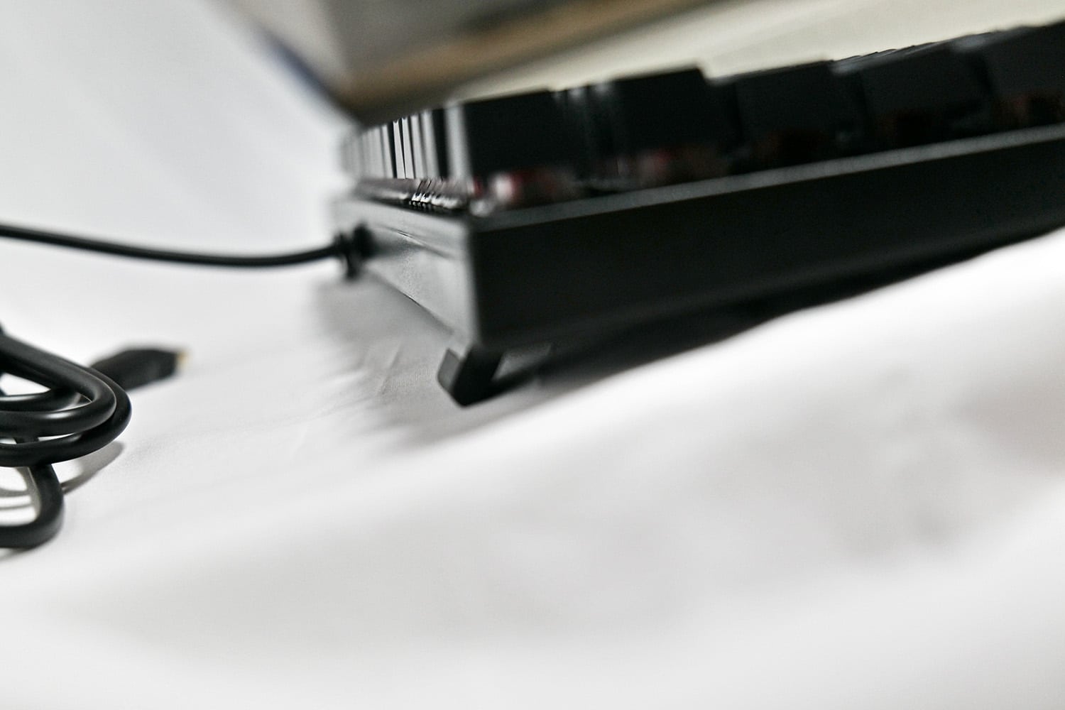 Ergonomisch fiel uns ebenfalls nichts Negatives auf. Die Form und Haptik der Tastenkappen fühlt sich gewohnt an. Die zwei hinteren ausklappbaren Standfüße sorgen für eine angenehme Neigung der Tastatur.