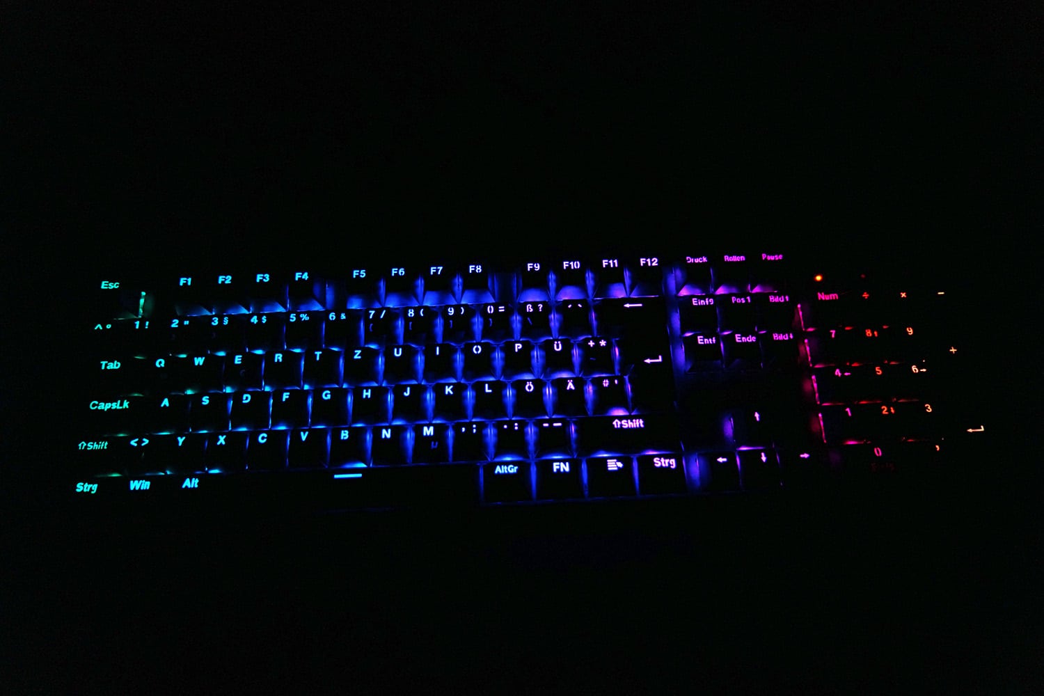 Die verbaute Aluminiumplatte macht die Tastatur zwar schwerer, aber auch robuster. Gut bewerten wir weiterhin die Ergonomie, selbst ohne Handballenauflage. Als überwiegend befriedigend schätzen wir die Verarbeitungsqualität, sowie die RGB-Beleuchtung ein, diese Punkte sind allerdings bereits grenzwertig.