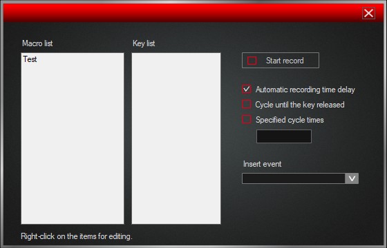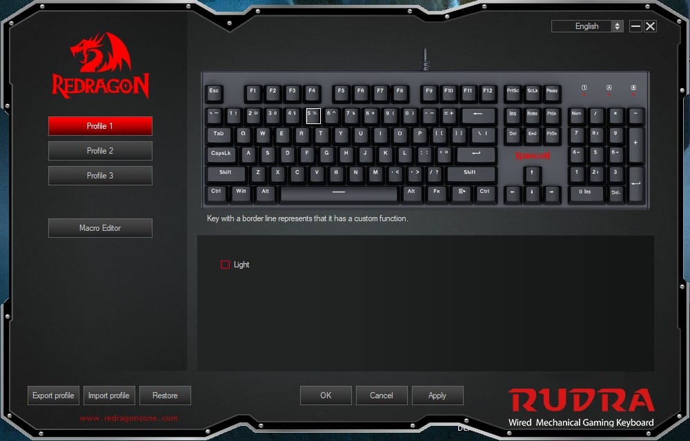 Das erste was uns nach dem Start der App auffiel, ist das gaming-typische Design der Oberfläche. Die App ist lediglich in den Sprachen Englisch und Chinesisch verfügbar, eher sparsam aufgebaut und bietet jedoch die wichtigsten Funktionen. So lassen sich allen Tasten der K565 eigene Funktionen oder ganze Makros zuweisen. Über den Makro-Editor lassen sich zuvor Makros anlegen und aufzeichnen.