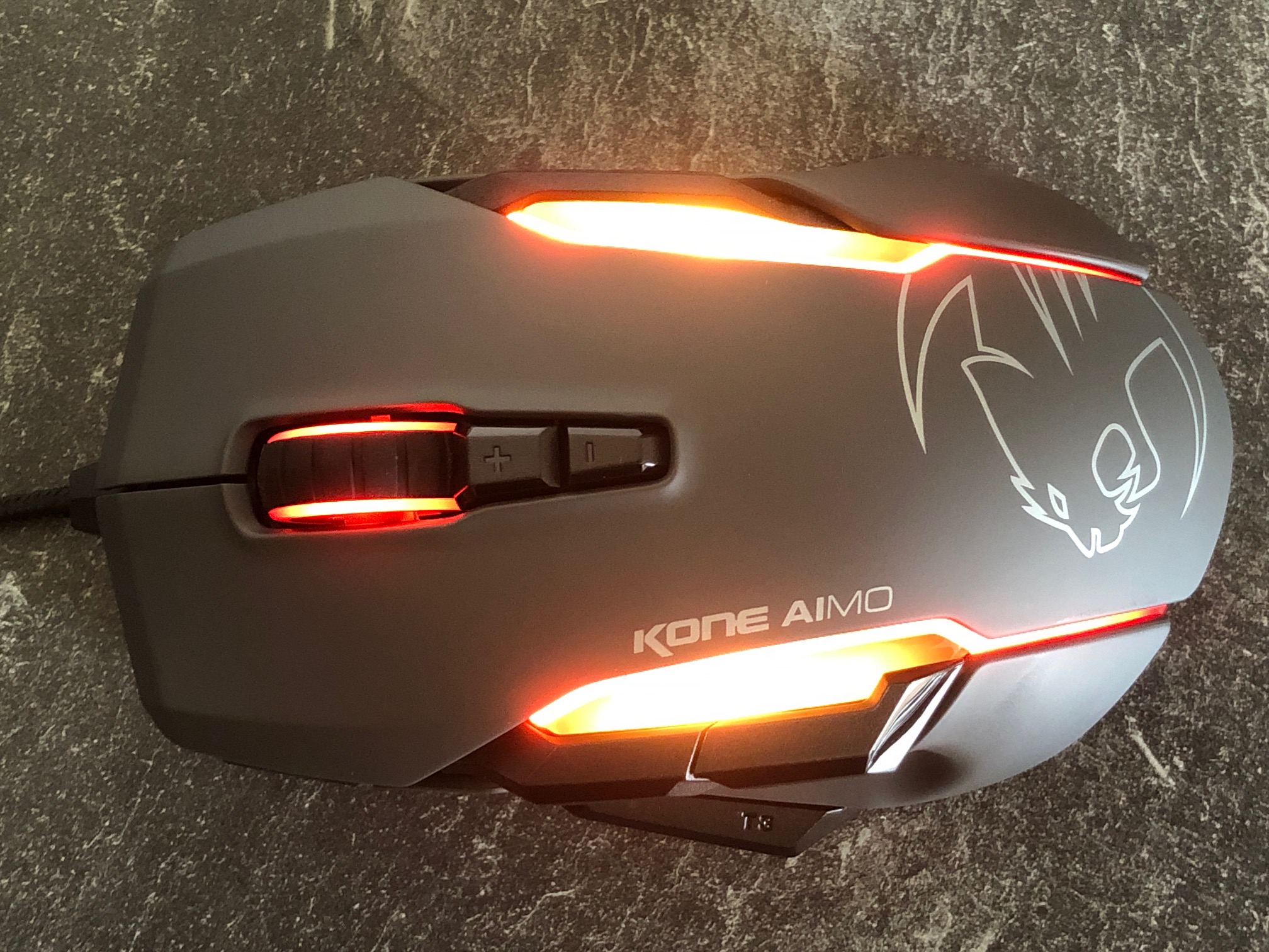 Das eigentliche Highlight der Roccat Kone Aimo ist die RGB-LED-Beleuchtung, die sich auf das Mausrad sowie zwei langgezogene LED-Streifen auf dem Mausrücken erstreckt. Die Zonen erstrahlen dabei hell und sehen sehr gut aus. Sollte die Beleuchtung abgeschaltet werden, sind die LED-Streifen komplett schwarz und sorgen weiterhin für einen sehr schicken Gesamteindruck.