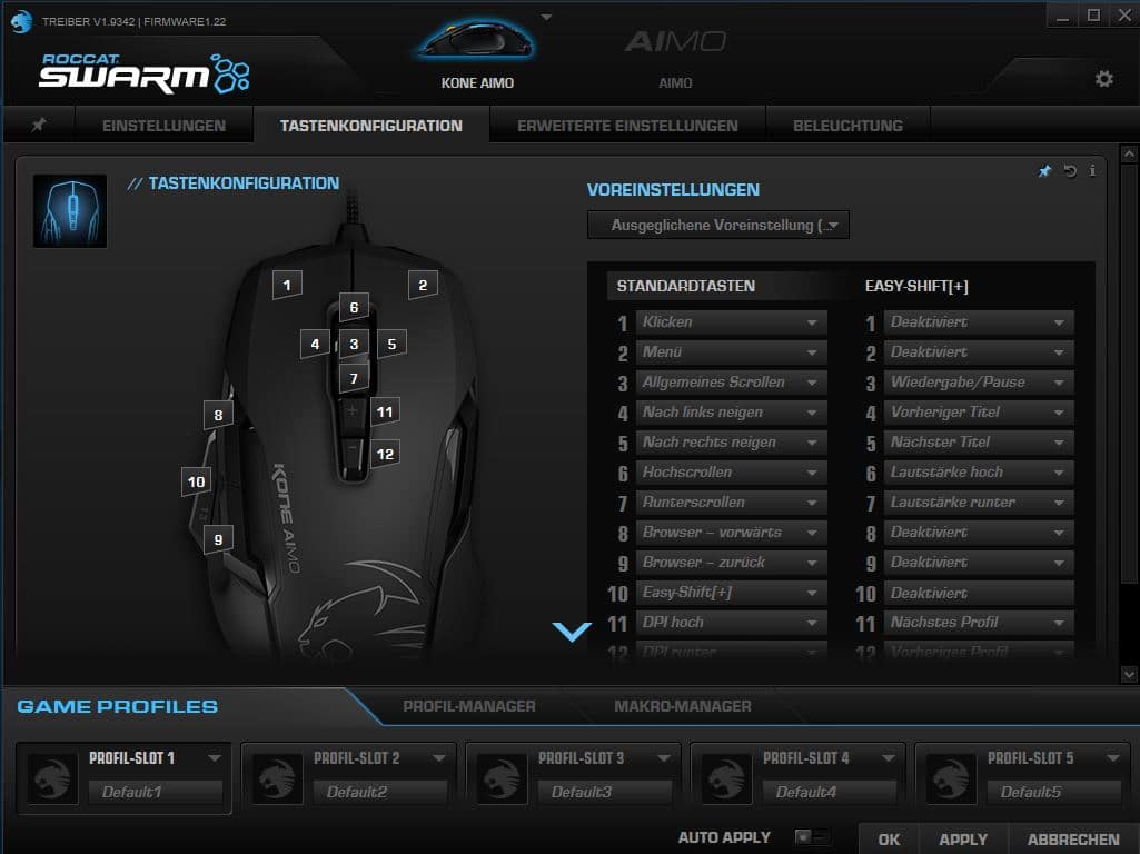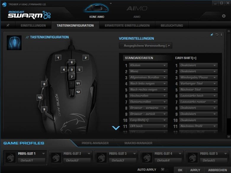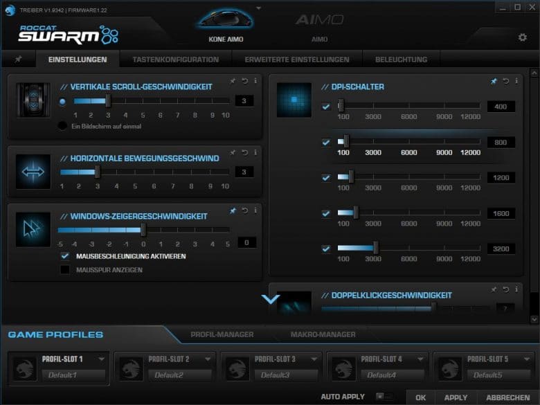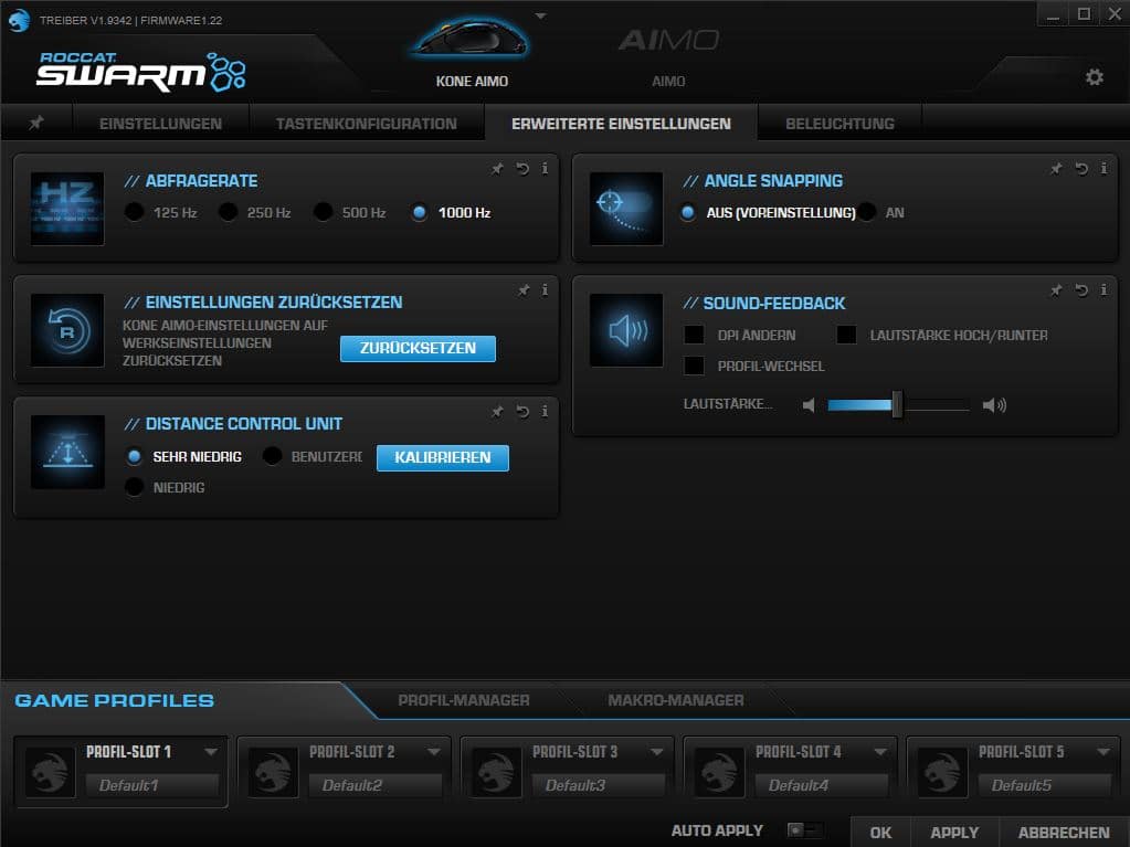 Mit der Roccat Swarm-Software erhaltet ihr zusätzlich ein mächtiges Tool für eine umfassende Kontrolle der zahlreichen Funktionen der Kone Aimo. So kann zum Beispiel die Polling-Rate auf 125 Hz, 250 Hz, 500 Hz oder 1.000 Hz verstellt werden, wobei die meisten Nutzer jedoch keinen Grund haben werden, vom 1.000 Hz Standard abzuweichen. Lift-Off-Rate sowie Sound-Feedbacks können ebenfalls in den erweiterten Einstellungen vorgenommen werden.